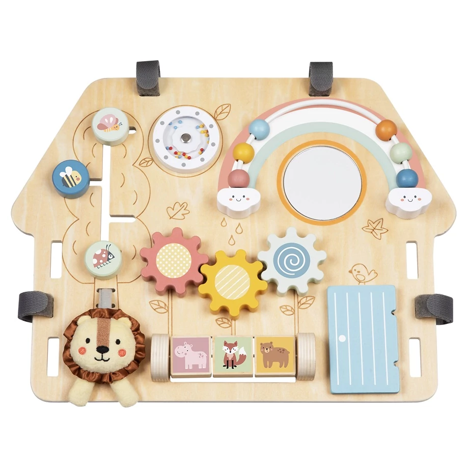Jemné barvy, roztomilé obrázky, zvuky, jako je chrastění perliček, a rozdílné textury povrchů stimulují smyslové vnímání dětí. Deska je opatřena praktickými podpěrami ve tvaru trojúhelníku, které zajišťují stabilitu při hře.