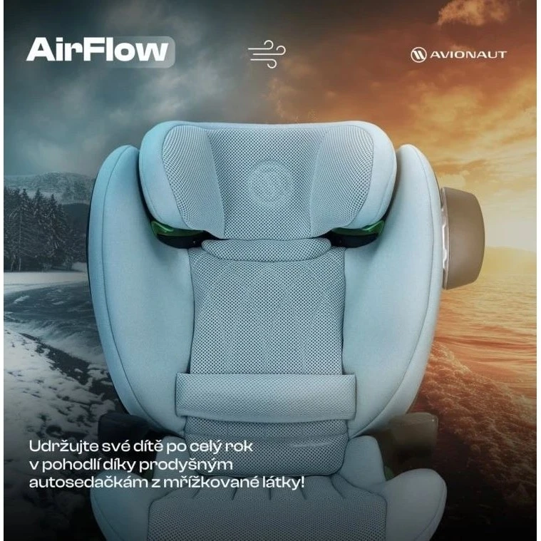 Dětská autosedačka Avionaut MaxSpace AirFlow poskytne vašemu dítku velmi bezpečné a komfortní cestování cca od 3,5 až do 12 let (100-150 cm).Avionaut MaxSpace AirFlow je vyrobená ze speciální síťoviny, která během horkých dnů udrží dítě v chladu a zabraňuje pocení. Během chladných dnů naopak působí jako izolační vrstva.