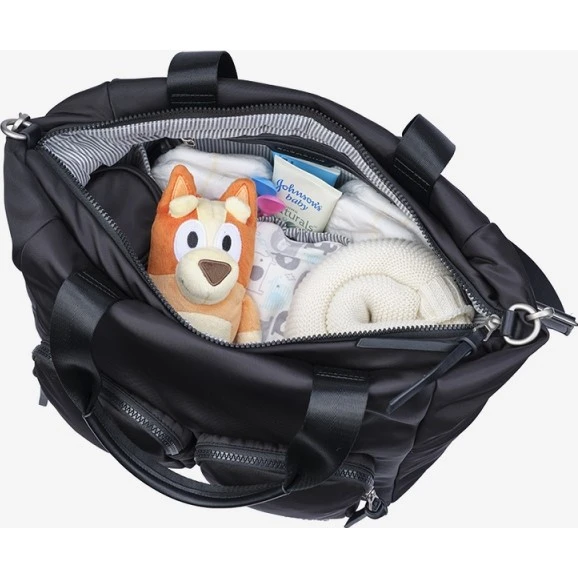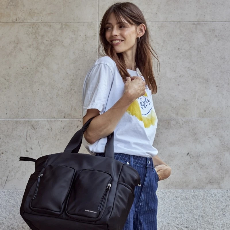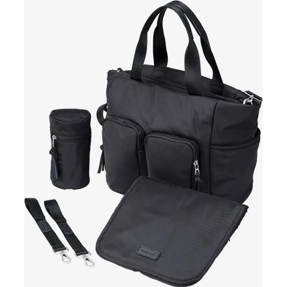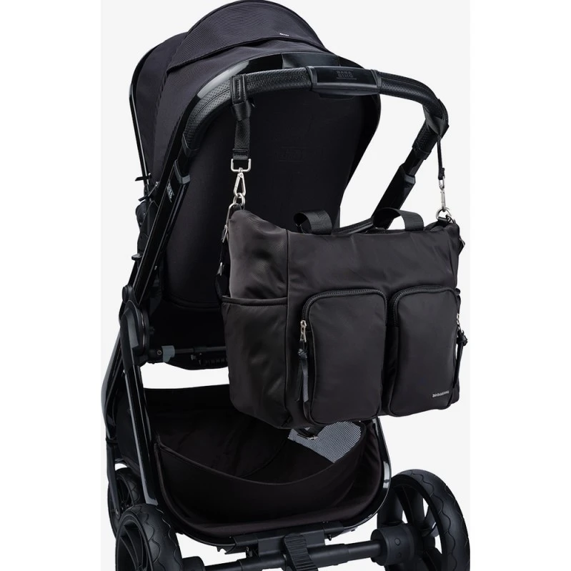 Nastavitelný ramenní popruh zajišťuje pohodlné nošení, ať už si tašku vezmete přes rameno nebo ji připevníte ke kočárku. Její univerzální černý vzhled se hodí ke každému outfitu i typu kočárku – a je ideální pro maminky i tatínky, kteří ocení minimalistický a funkční design.