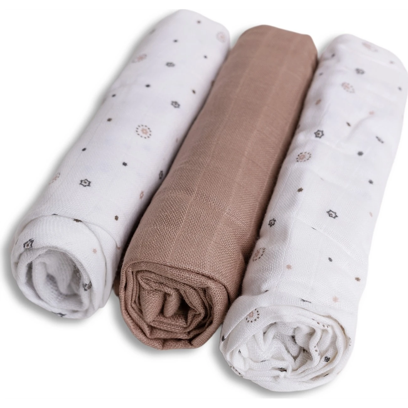 Plenky v rozměru 70 × 70 cm mají univerzální využití - poslouží jako klasická plena, lehká osuška, přebalovací podložka či dečka. Balení obsahuje 3 kusy, z toho 2 s potiskem a 1 jednobarevnou.