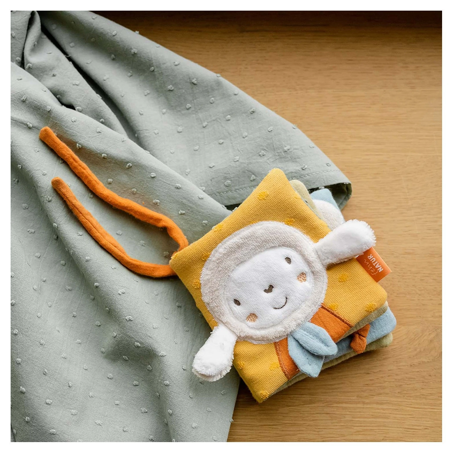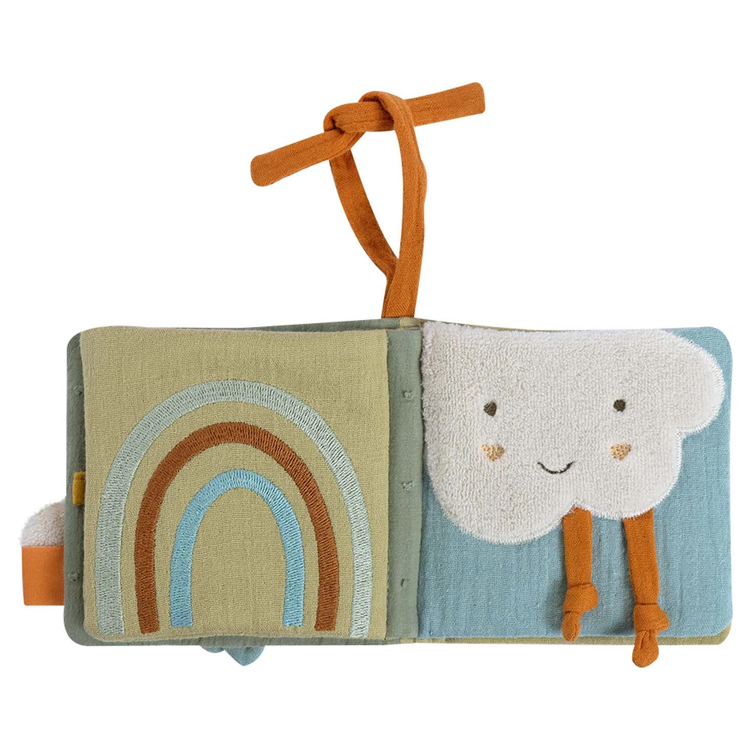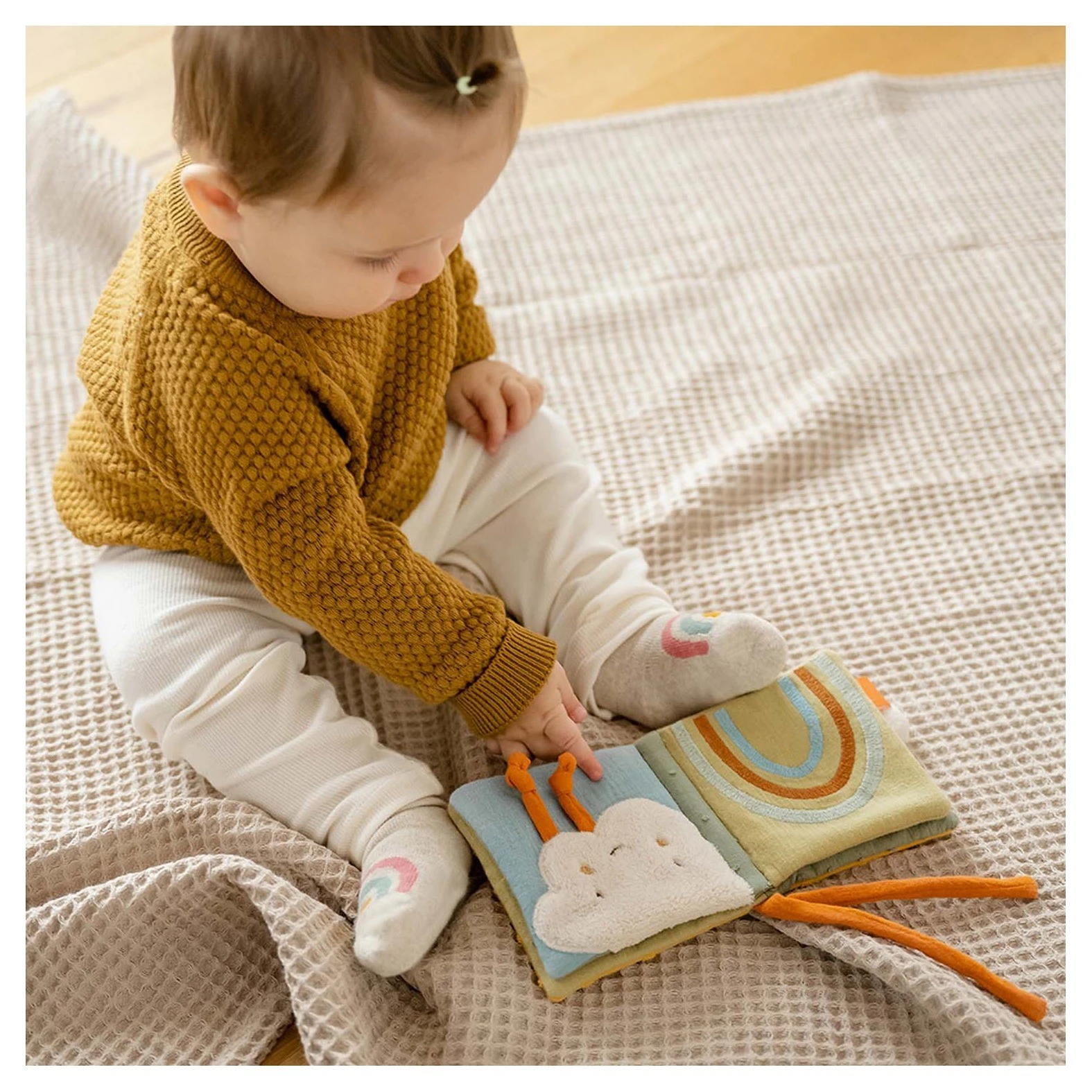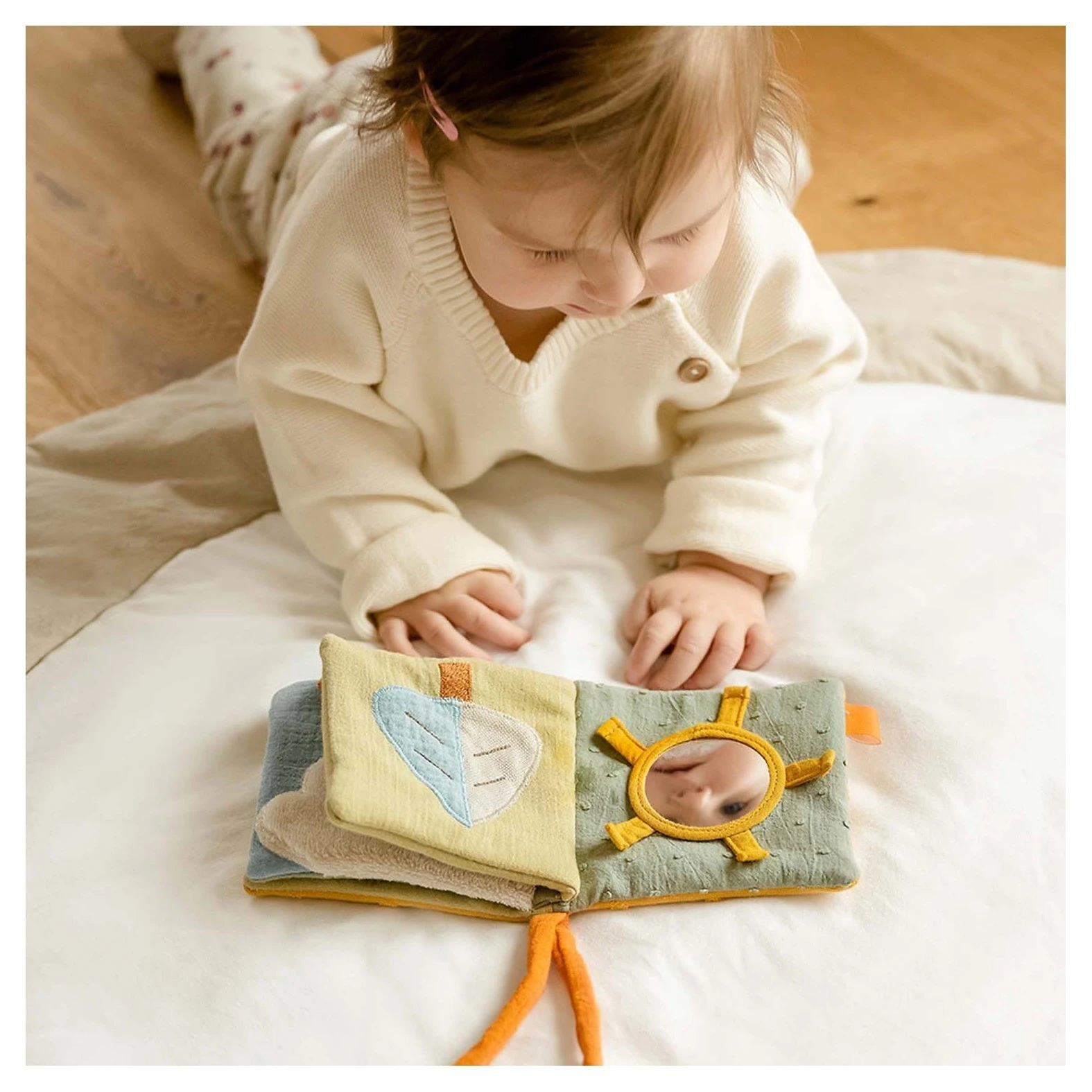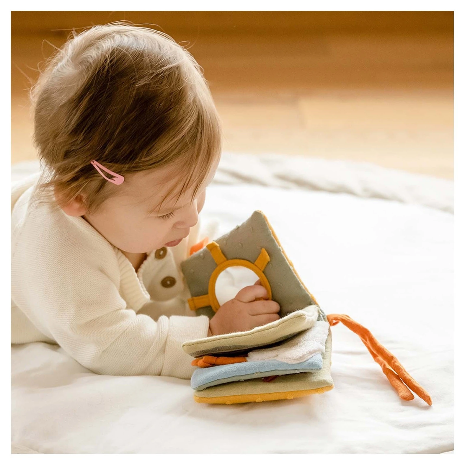 Plyšová knížka ovečka od renomované značky Babyfehn je ideální první knížkou pro vaše děťátko. S šesti zábavnými stránkami plnými různých motivů, jako jsou ovečka, slunce, strom, duha, mrak, měsíc či dům, poskytuje nekonečné možnosti objevování a zábavy.Knížka je vybavena různými herními prvky, včetně pískátka, šustícího papíru a bezpečného zrcátka, které stimulují smysly dítěte a podporují jeho motorický vývoj. Různé textury a materiály, jako jsou žerzej, mušelín, froté a velur, nabízejí příjemný hmatový zážitek a podporují rozvoj hmatu a úchopu.