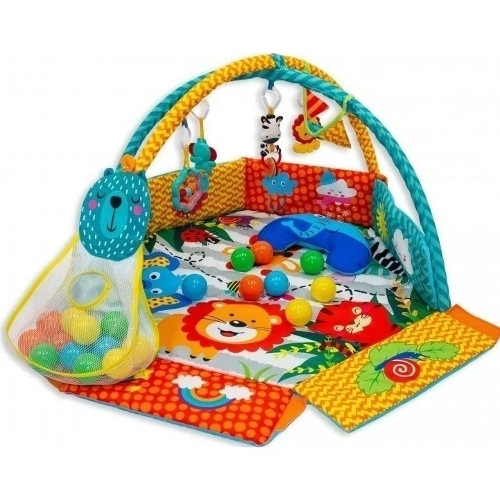 Hrazdička s pěti zavěšenými hračkami podporuje vizuální a motorický rozvoj dítěte a lze ji snadno odejmout pro samostatné použití. Součástí je měkký polštářek, který poskytuje pohodlí a podporu během ležení na bříšku.