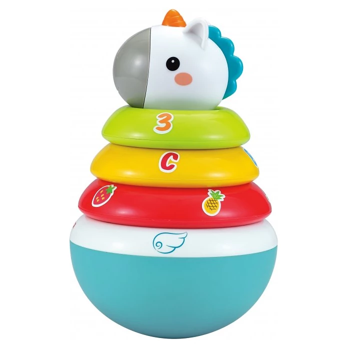 Veselý jednorožec Bo Jungle je skvělý hlavně svou všestranností. Podporuje hned několik fází vývoje dětí. Nejmenší si osvojí hmatové dovednosti a koordinaci ruka-oko. Později se s ní děti mohou učit barvy, čísla, písmenka i ovoce.Kývající základna s kolíkem má na sobě 3 chrastící a barevné kroužky a hlavu jednorožce, které děti milují.