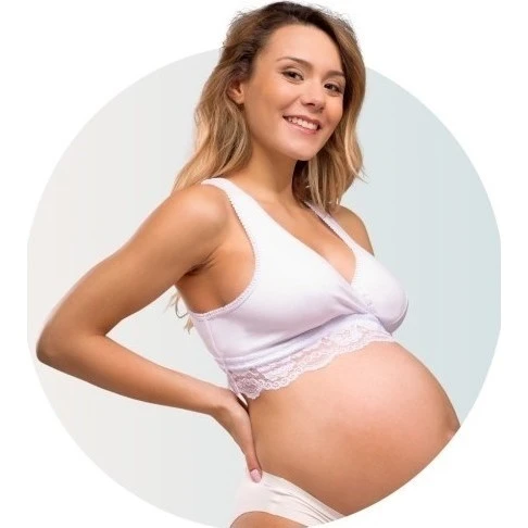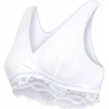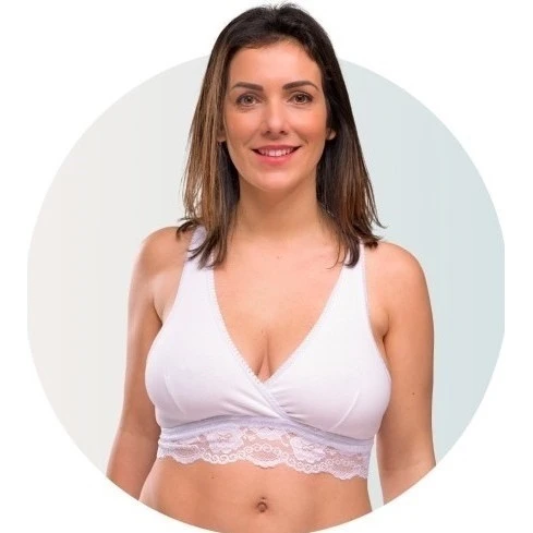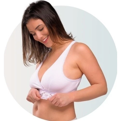 Křížený střih poskytuje snadný a rychlý přístup pro kojení. Podprsenka je dokonale pohodlná a je vhodná i na spaní. Elastická krajka dodává navíc jemný a elegantní vzhled.Podprsenka má široká ramínka a je z příjemné bavlny s elastanem.