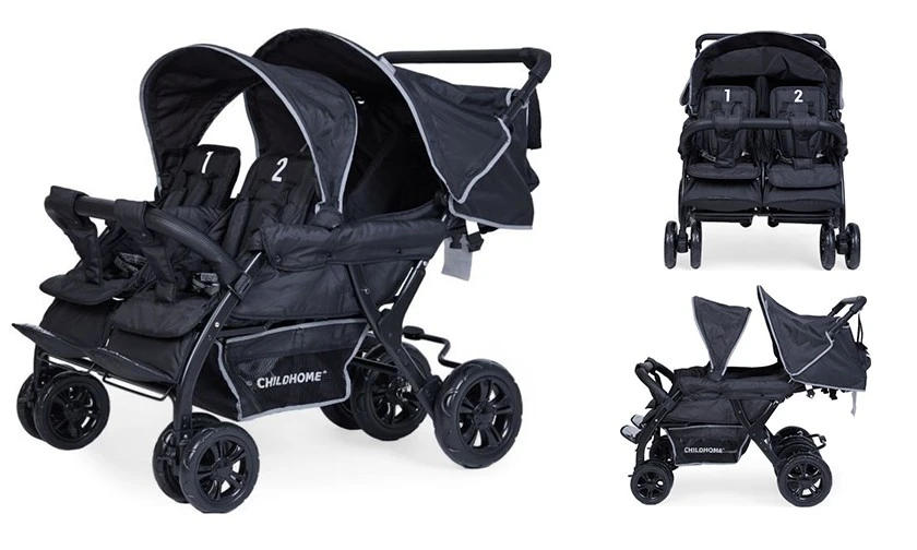 ChildWheels QUADRUPLE je zcela unikátní kočárek pro 4 děti, který se chová tak, jako by vezl pouze 2 děti. QUADRUPLE je vhodný nejen pro čtyřčata, ale také třeba pro kojenecké ústavy, nebo všechna místa, kde je potřeba vozit 4 děti, které nemusí být stejně staré.Kočárek jezdí po speciálních nenafukovacích kolech, která zajišťují měkkou jízdu bez zbytečného odporu. Aby se s kočárkem jezdilo perfektně, tak přední kolečka jsou otočná o 360°.