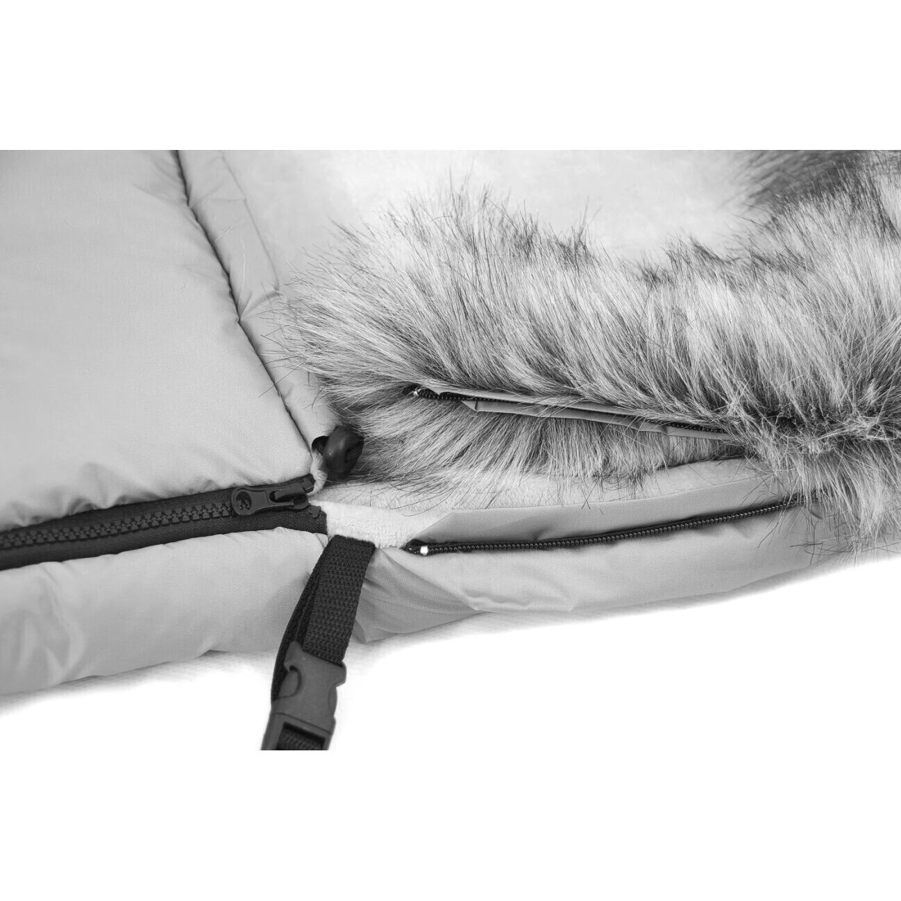 Fusak má dvojité zajištění proti sklouzávání z kočárku. Na zádech je protiskluzový popruh přes celou šíři a po stranách jsou úchyty pro připevnění ke konstrukci kočárku.