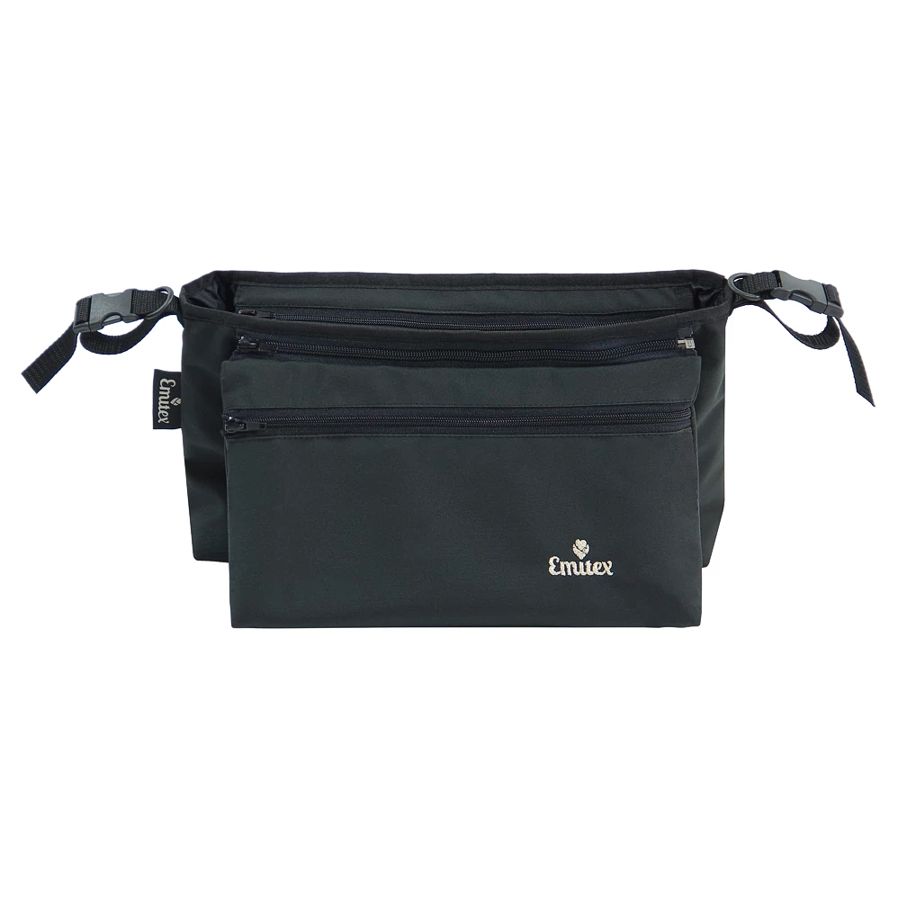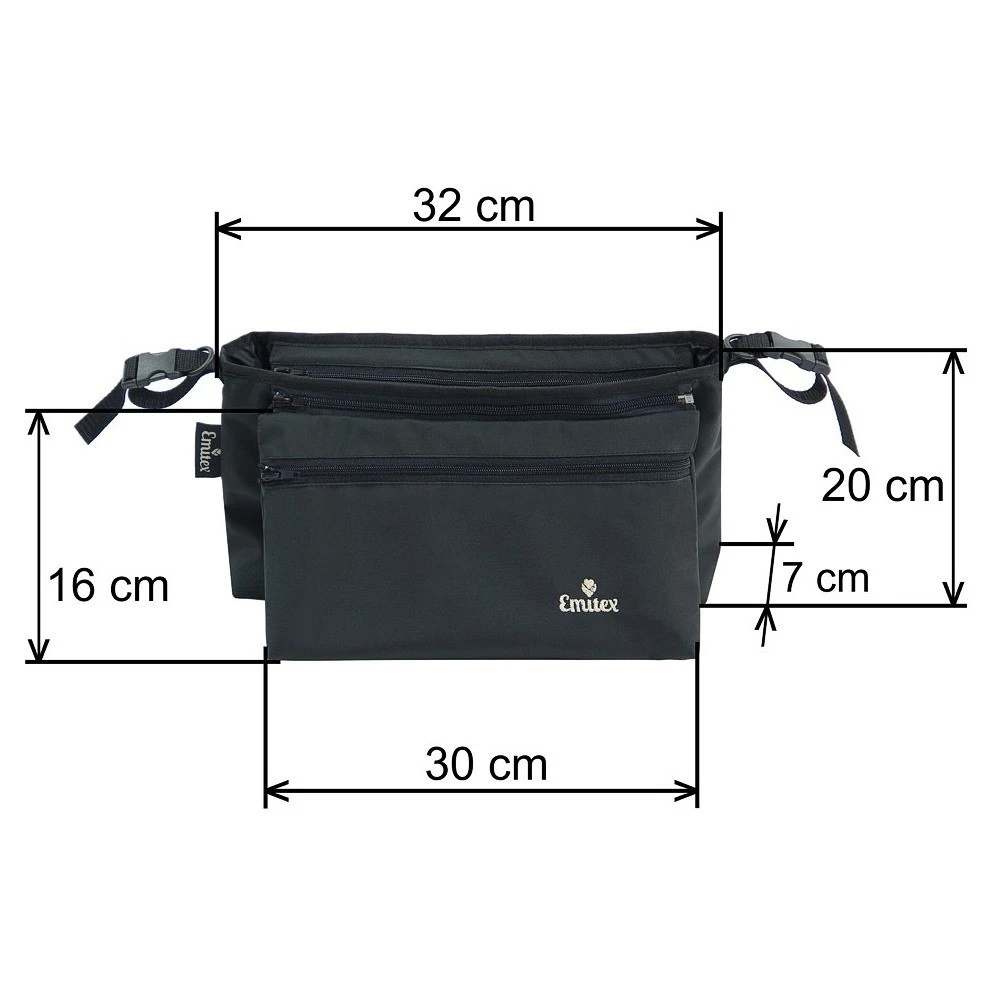 Rozměry organizéru jsou 32 x 7 x 20 cm, menší taška má rozměry 30 x 3 x 16 cm. Pro ještě větší pohodlí je možné dokoupit ramenní popruh, díky kterému lze organizér nosit jako klasickou tašku. Emitex Organizér Simple S je dostupný v několika barevných variantách, což umožňuje sladění s vaším kočárkem.