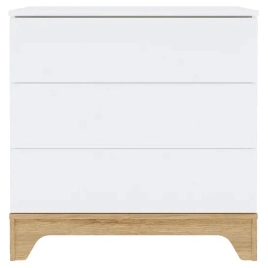 Vyrobena z nábytkové desky a masivního dřeva, komoda nabízí dlouhou životnost a odolnost. Její nadčasový design s čistými liniemi a kombinací bílých ploch a dřevěných prvků se snadno začlení do jakéhokoli interiéru.
