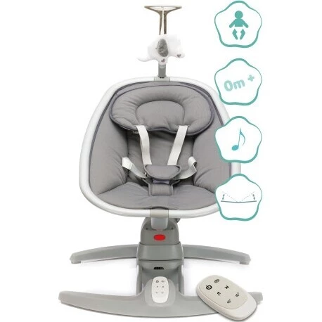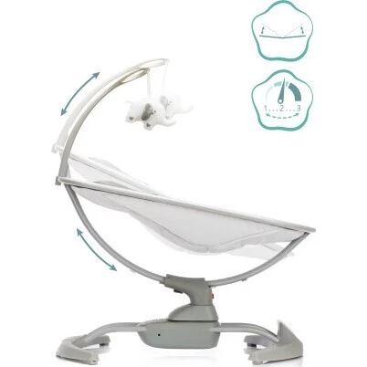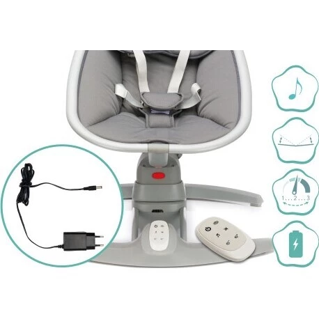 Lehačku lze napájet pomocí přiloženého síťového adaptéru. Rychlost houpání lze zvolit ze 3 variant, dokáže přehrávat 8 různých melodií a výškově nastavitelný hrací oblouk se postará o dětskou pozornost, kdy bude pozorovat zavěšené hračky. Sedadlo je velmi pohodlné, měkce polstrované a navrženo tak, aby podporovalo správný vývoj zad.