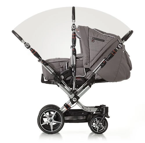 Nová verze velmi oblíbeného kočárku Hartan Topline CL. Po dokoupení tašky na miminko, nebo korbičky využitelný již od narození.Dominantou Hartanu Topline X jsou 4 velká pevná kolečka a přehazovací rukojeť. Jste tedy schopni pružně reagovat na aktuální potřeby Vašeho miminka (sluníčko svítí do očí...). Celou sportovní sedačku můžete na Toplinu X odepnout z konstrukce a poté můžete kočárek ještě lépe složit, nebo na konstrukci nacvaknout adaptér na jakoukoliv autosedačku.