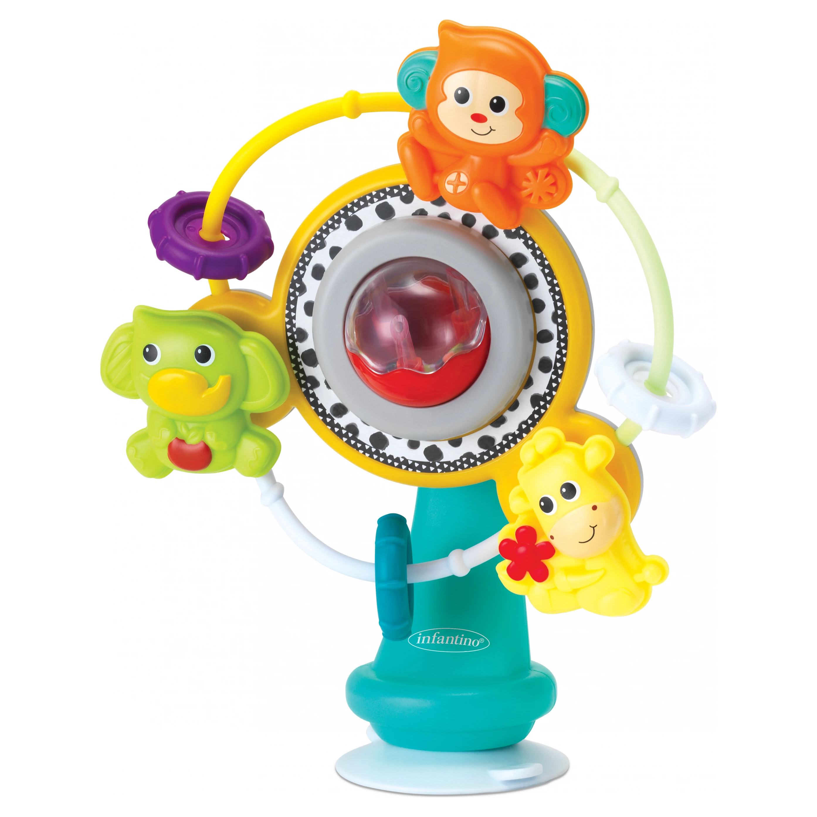 Infantino kolotoč se zvířátky Jungle je pestrobarevná hračka navržená pro děti od 6 měsíců, která podporuje jejich smyslový a motorický vývoj. Díky praktické přísavce lze kolotoč snadno připevnit na hladké povrchy, jako je pultík jídelní židličky nebo stůl, což zajišťuje stabilitu během hry.Kolotoč se skládá z několika roztomilých zvířátek, která lze rukou roztočit. Při otáčení se aktivuje průhledný míček uprostřed kolotoče, ve kterém se nacházejí korálky vydávající chrastivý zvuk. Tento zvukový efekt stimuluje sluchové vnímání dítěte a zároveň podporuje jeho koordinaci rukou a očí.