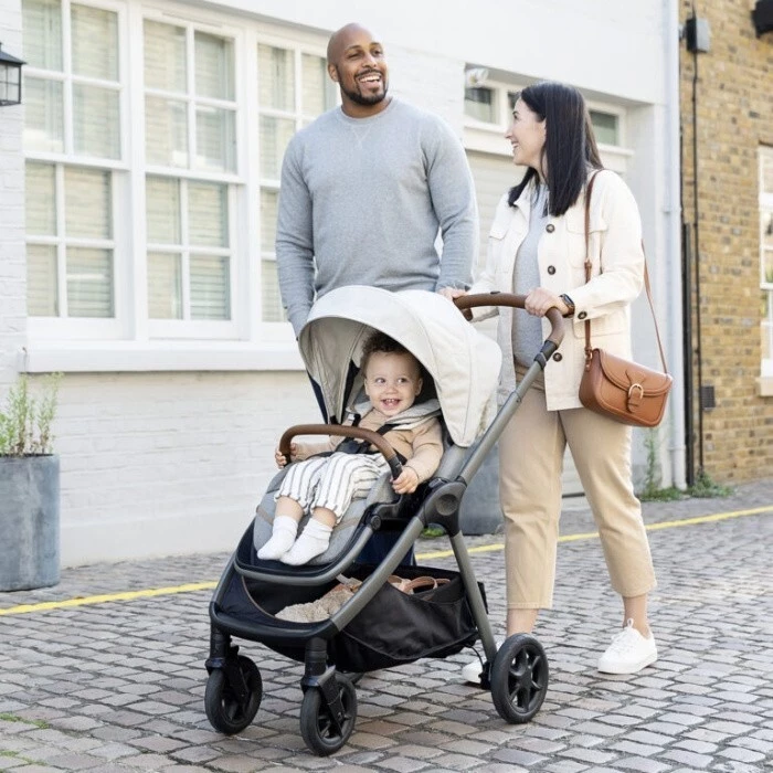 Teleskopická rukojeť kočárku je nastavitelná, takže vyhovuje každému, kdo kočárek řídí.