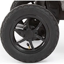 Odpružení všech kol zajišťuje pohodlnou jízdu, přední kola jsou otočná a mají možnost aretace. Zadní kola jsou nafukovací a přední kola s možností aretace jsou pěnová, kočárek tak zvládne i horší terén.