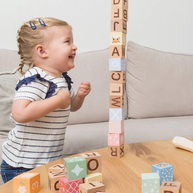 JOUÉCO Dřevěný vozíček s kostkami 12m+
