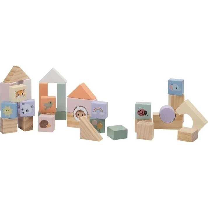 34 barevných dřevěných kostek různých tvarů a velikostí, ideálních pro stavění, třídění a poznávání barev a tvarů.
