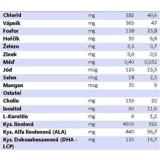 Složení: organické plnotučné mléko, organická demineralizovaná bílkovina mléčné syrovátky v prášku, organické odstředěné mléko, organické rostlinné oleje (slunečnicový, kokosový, řepkový), organické Galakto-oligosacharidy (z mléka), citrát vápenatý, citrát sodný, chlorid draselný, mléčnan vápenatý, chlorid hořečnatý, kyselina dokosahexaenová (olej z mikrořas Schizochytrium sp. T18).), Vitamín C, hydroxid draselný, cholin bitartát, inositol, pyrofosforečnan železitý, síran zinečnatý, Vitamín E, L-karnitin, Niacin, kyselina pantothenová, síran měďnatý, Thiamin, Vitamín A, Vitamín B6, Riboflavin, Kyselina listová, síran manganatý, jodid draselný, seleničitan sodný, Vitamín K, Vitamín D, Biotin, Vitamín B12.