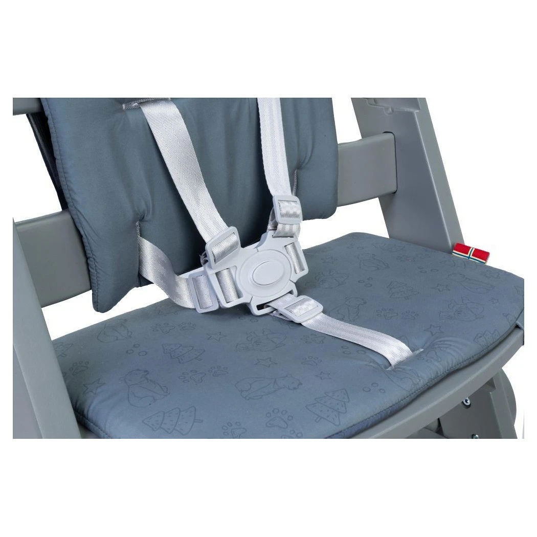 Pro maximální bezpečnost je židlička vybavena 5bodovým bezpečnostním pásem, který lze v případě potřeby snadno odstranit. Protiskluzové nožičky zajišťují stabilitu a zabraňují nechtěnému pohybu po podlaze.