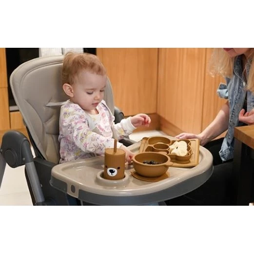 Radost ze stolování a možnost ochutnávat různé pokrmy! Přesně k tomu je stvořený silikonový dělený talíř s podložkou Kidnort Retter.Tvar medvídka se dětem velmi líbí a nebudou vědět, kterou přihrádku dříve spapat, aby objevili celé zvířátko. Materiál je naprosto nezávadný a neobsahuje BPA. Silikon je navíc naprosto nerozbitný, hypoalergenní a lehký.