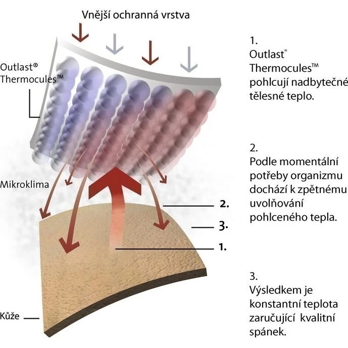 Termoregulační materiál Outlast se skvěle přizpůsobí dané situaci. Pokud zjistí, že se dítko přehřívá, okamžitě začne akumulovat přebytečné teplo. V opačném případě funguje přesně obráceně. Tímto způsobem snižuje míru pocení až o 40%.