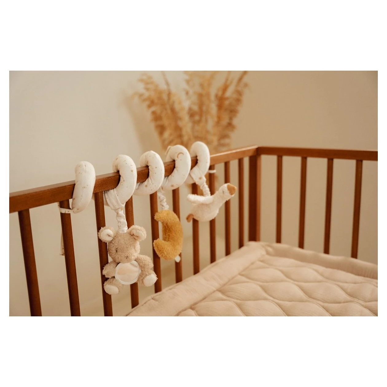 Little Dutch Spirála Newborn Naturals je interaktivní textilní hračka navržená pro zábavu a stimulaci smyslů vašeho miminka. Tato spirála je ideální pro použití v postýlce, kočárku nebo autosedačce, kde poskytuje nekonečné možnosti objevování a hraní.Spirála je vybavena třemi zavěšenými hračkami ve tvaru kačenky, králíčka a měsíčku. Každá z těchto hraček nabízí různé smyslové podněty.