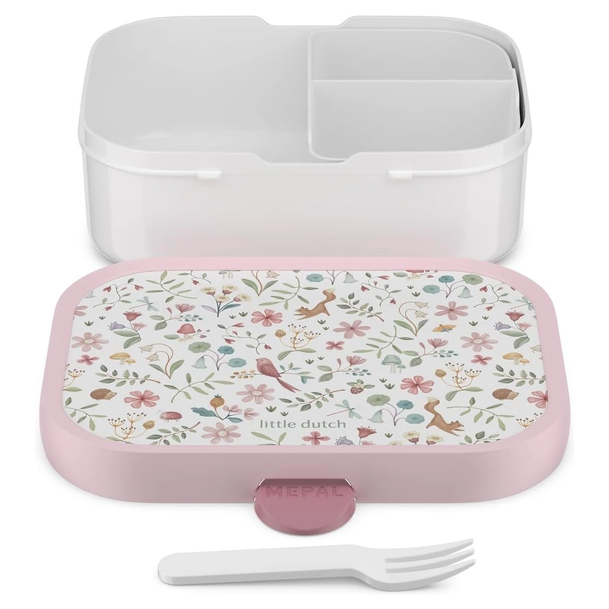 * Svačinový box - nabízí možnost rozdělení na tři přihrádky pomocí vyjímatelné přepážky, což umožňuje oddělit různé druhy potravin. Součástí boxu je také malá vidlička, ideální pro napichování kousků ovoce či zeleniny.