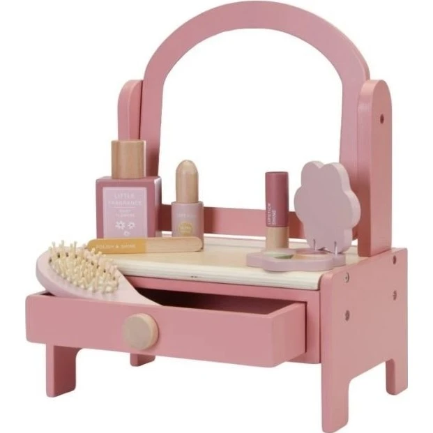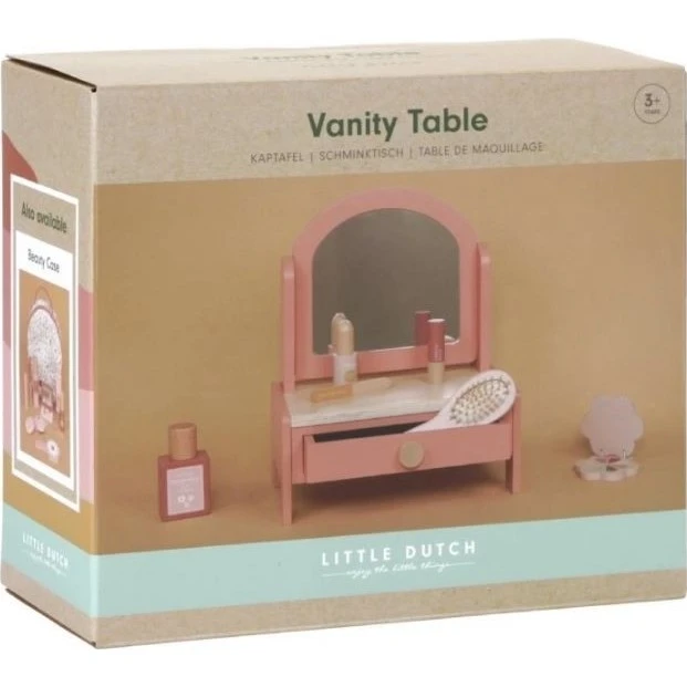Máte doma malou parádnici? Pak jí tento toaletní stolek s příslušenstvím od Little Dutch přímo uchvátí.Malé holčičky tak rády napodobují své maminky. Stolek se stane důležitou součástí dětského pokojíku. Toaletní stolek obsahuje zrcadlo, kartáč na vlasy, parfém, rtěnku, oční stíny, pilník a lak na nehty.