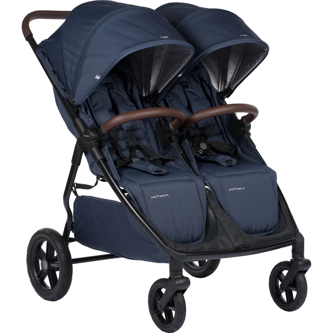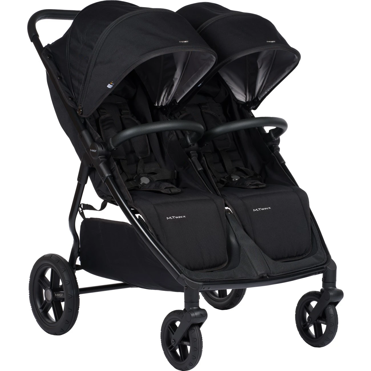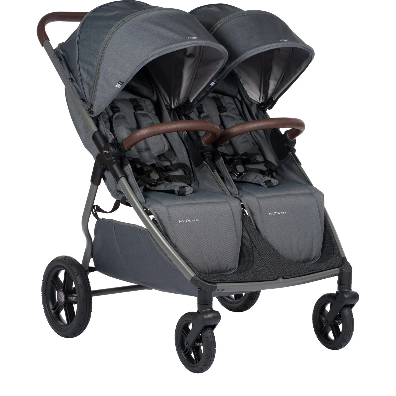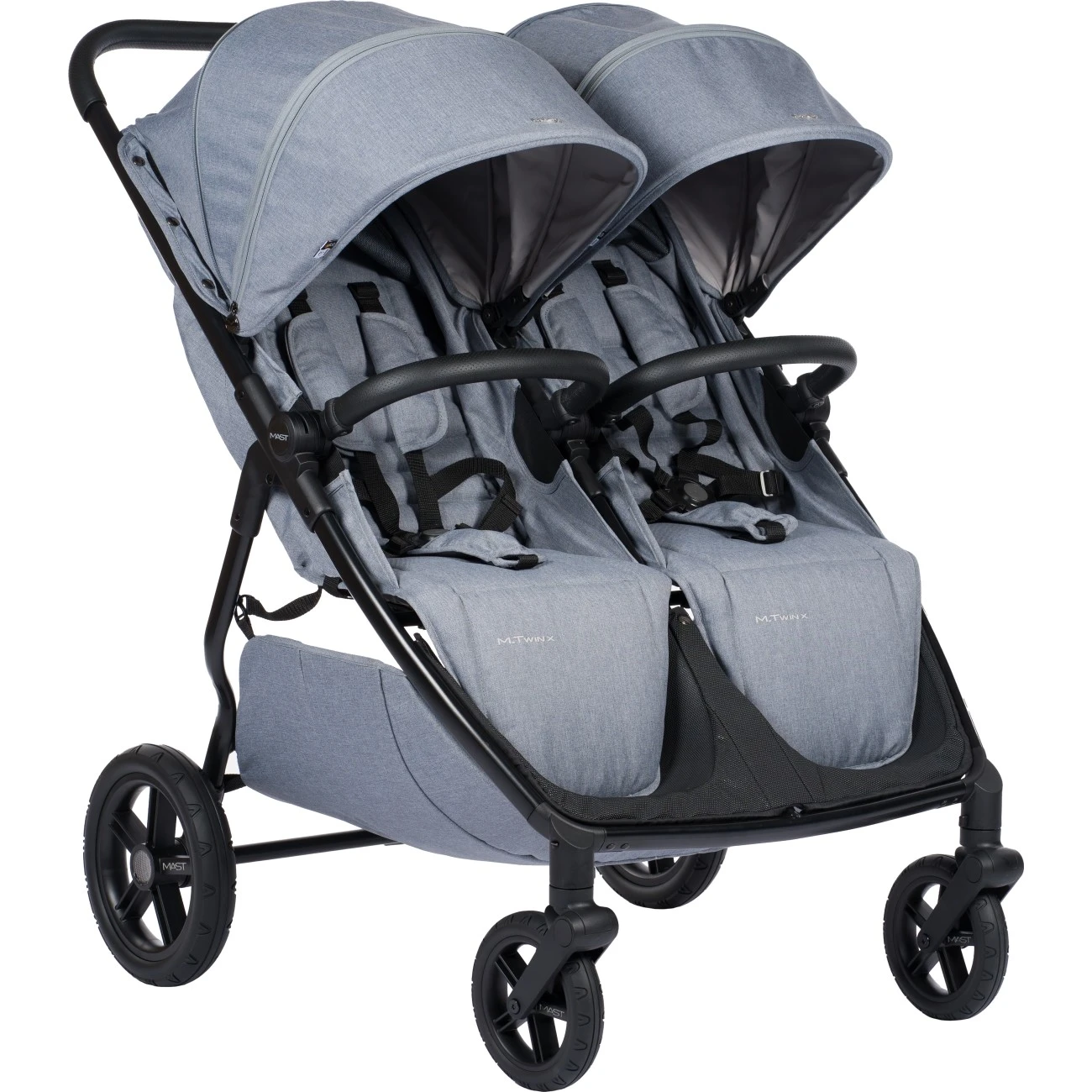 Mast M.Twin X je kombinovaný kočárek pro 2 děti, který Vám pohodlně umožní kombinaci užití pro dvojčátka, ale i sourozence.Základem kočárku je lehká městská konstrukce, vybavena gumopěnovými koly. Přední kolečka jsou otočná o 360°. Zadní - větší kolečka mají v průměru 27,5 cm a přední - menší 18,5 cm.