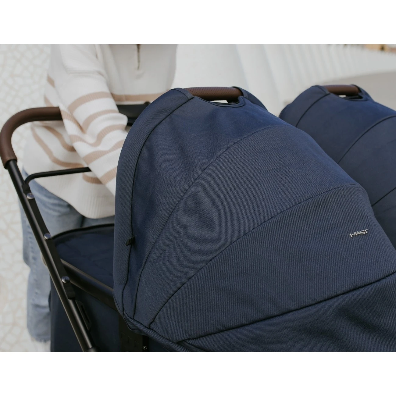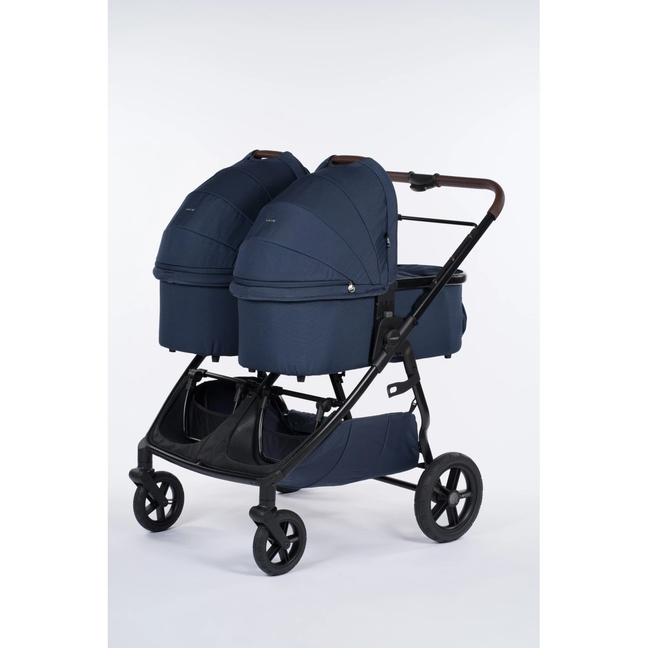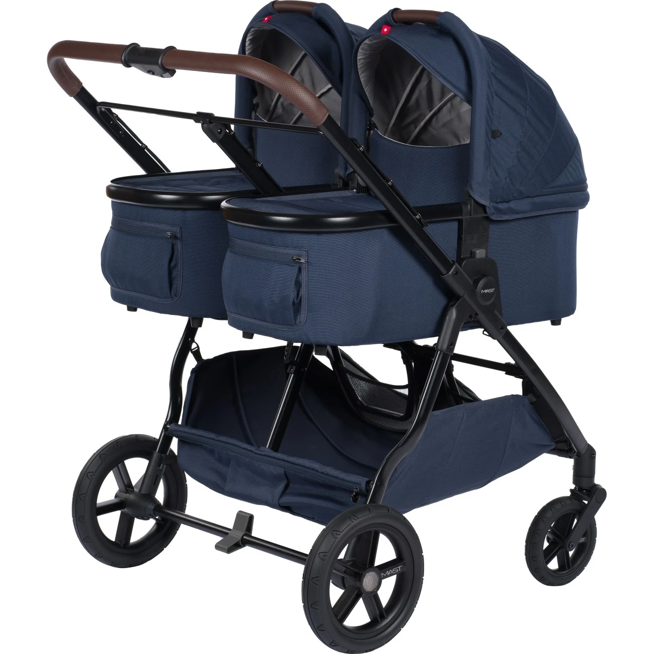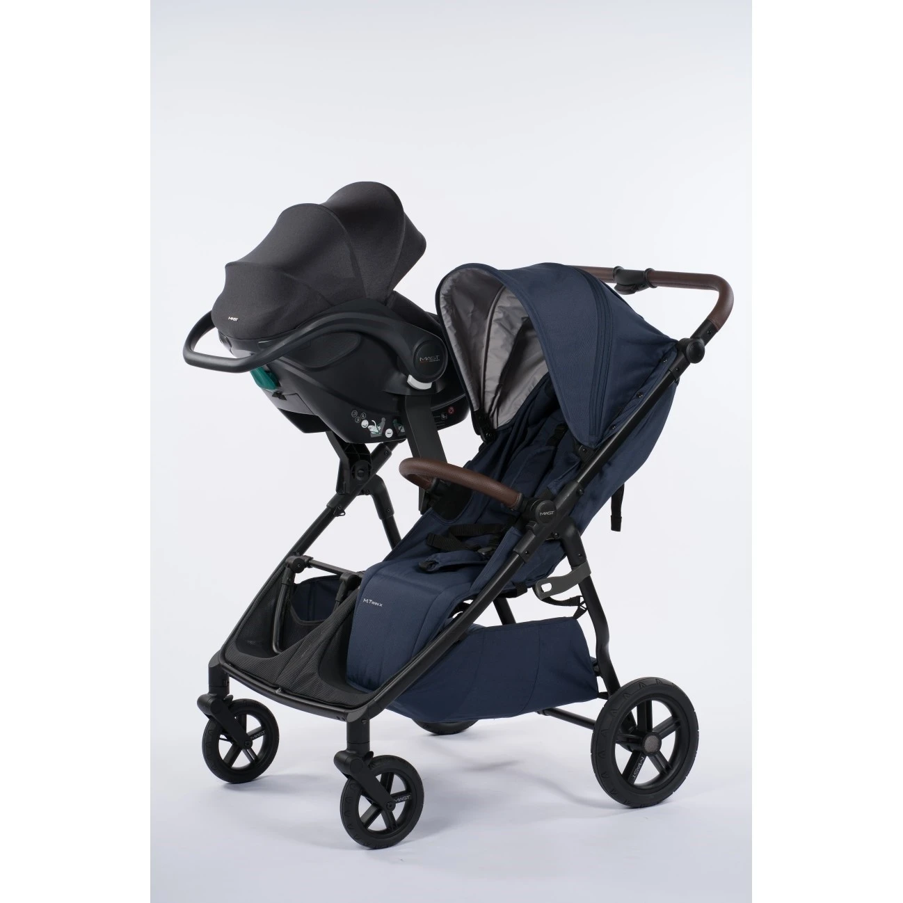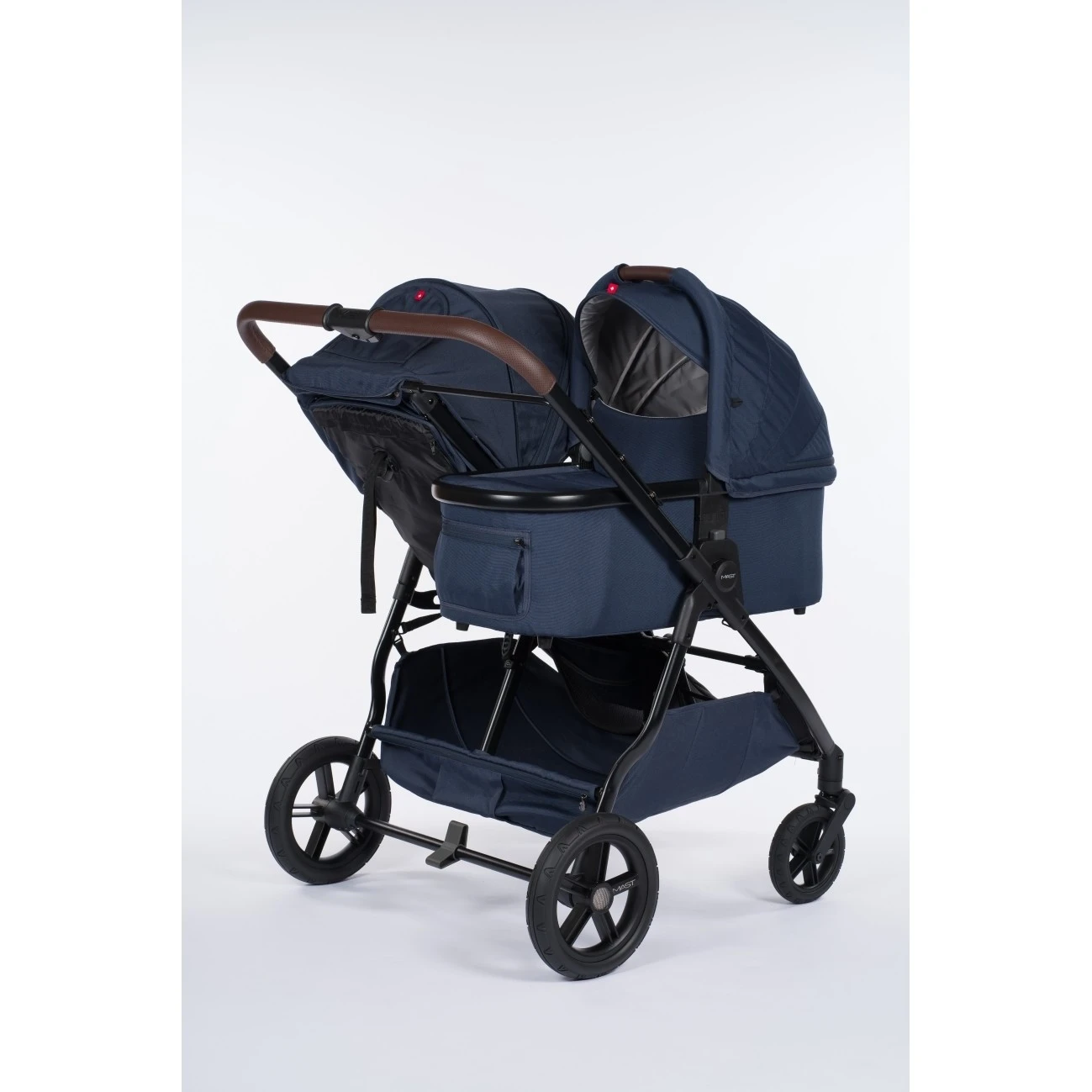 Mast M.Twin X může fungovat také jako kočárek od narození. Stačí si dokoupit jednu, nebo dvě, hluboké korbičky. Díky tomu si můžete vytvořit funkční kombinaci pro dvojčátka (2 hluboké korbičky vedle sebe), nebo sourozeneckou variantu (1 sportovní sedačka a 1 korbička, vedle sebe).