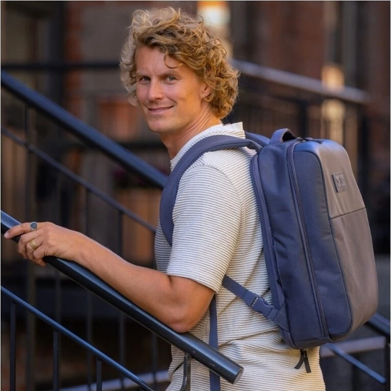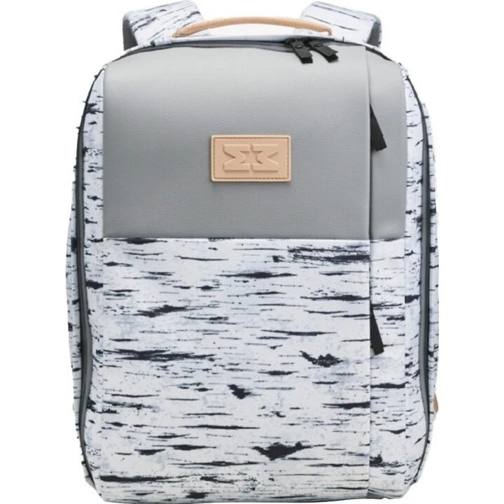 Polstrovaná zadní část a popruhy zajišťují pohodlí nošení, zatímco speciální přezky umožňují snadné připevnění k nosiči Shoulder carrier G5. Dále batoh obsahuje přihrádku pro PC nebo tablet a prostor pro složený nosič, což zdůrazňuje jeho multifunkčnost.
