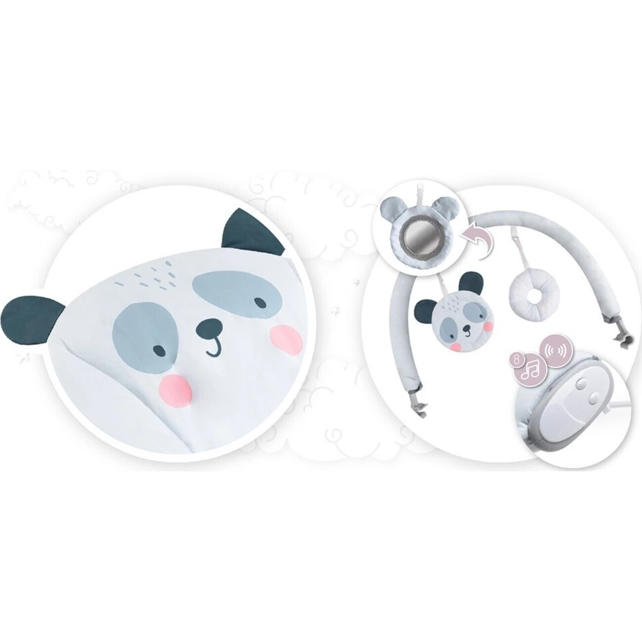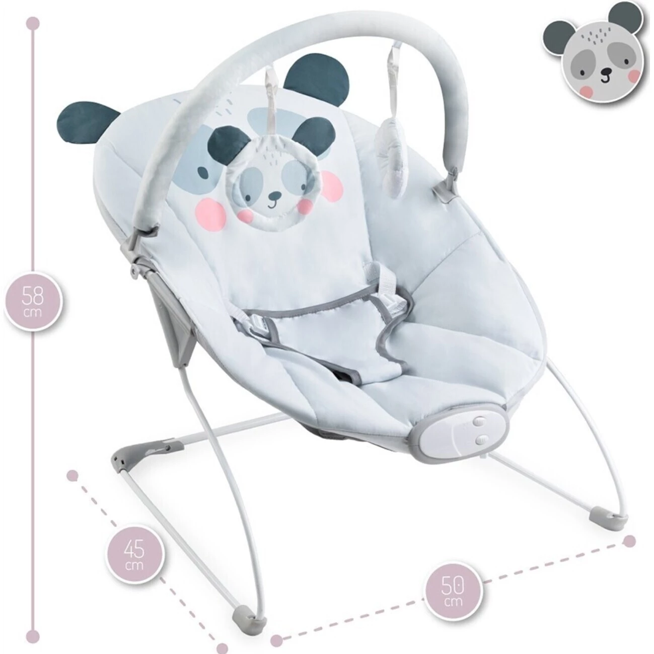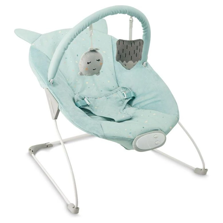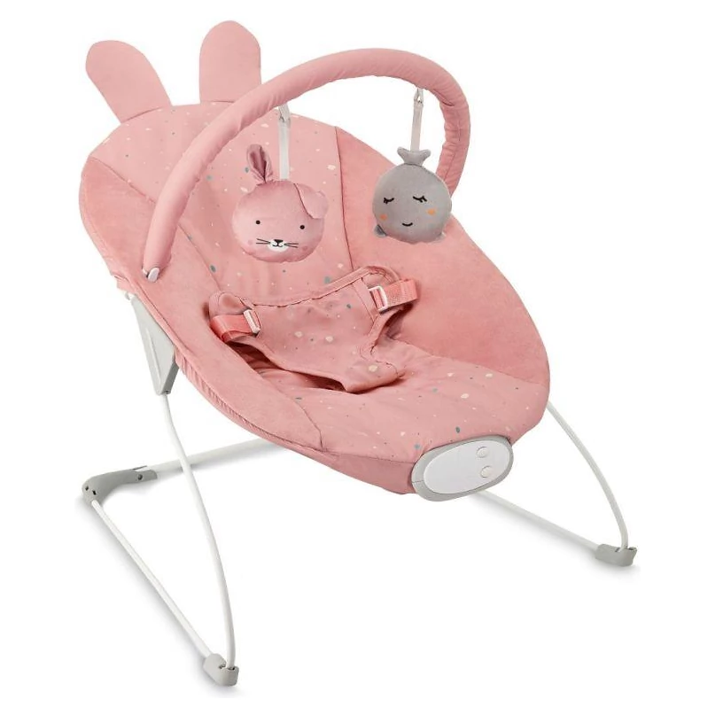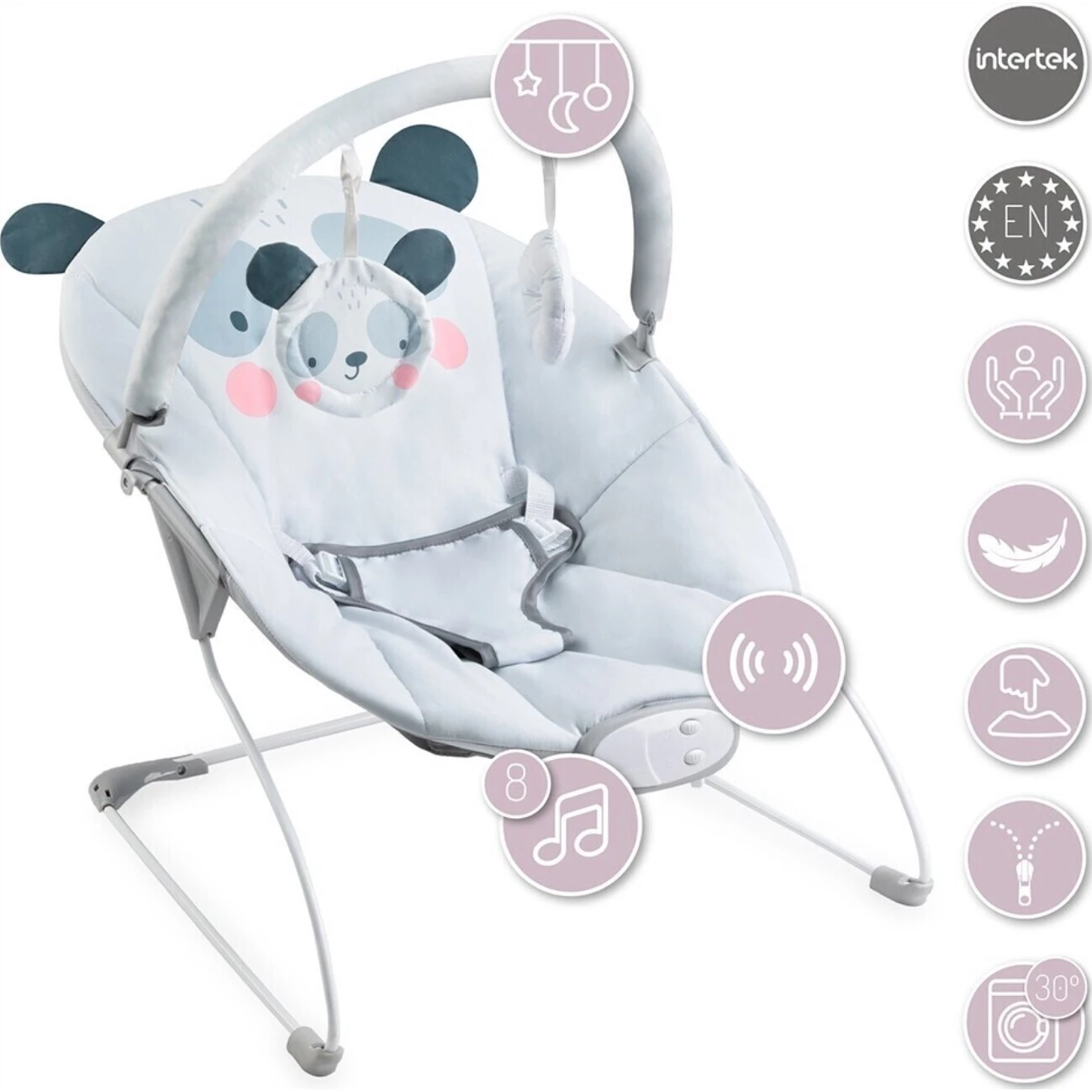 Součástí jsou také krásné hračky. Na výběr je z 8 jemných melodií. Bezpečí zajistí 3 bodový pás, který dátko udrží na místě. Potah je snímatelný a je možné ho vyprat. Konstrukce má gumové protiskluzové podložky.