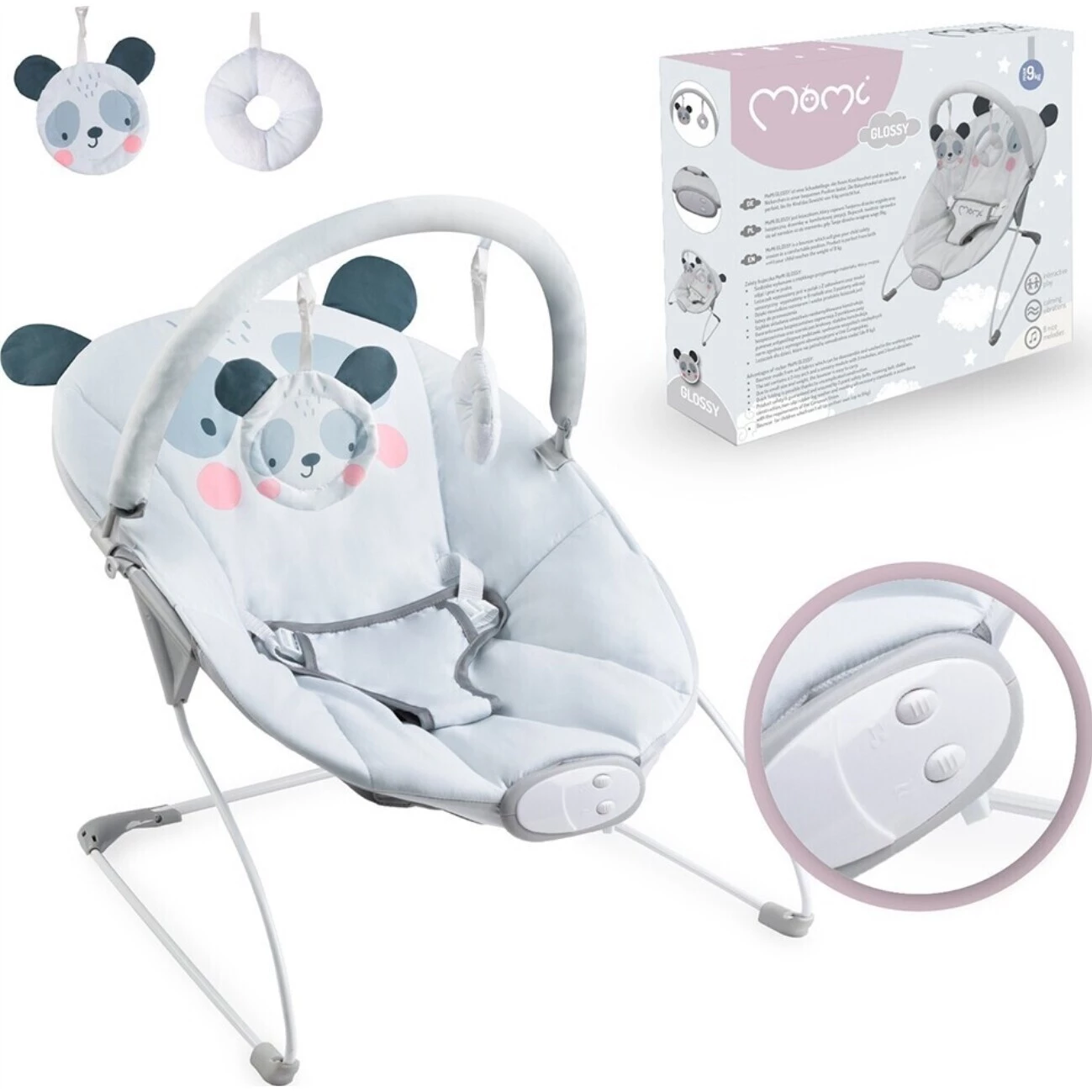 Vibrační lehátko MoMi Glossy s melodiemi je skvělým místečkem, kde můžete nechat v bezpečí miminko odpočívat a přitom si kousek od něj uvařit nebo užít chvilku pro sebe. Miminko dokonale dokáží uklidnit jak vibrace, tak i jemné melodie.Lehátko je lehké a snadno ovladatelné. Má jednoduchý ovládací panel, který je napájený pomocí baterií (nejsou součástí balení). Lehačka má velmi měkké polstrování, ergonomické opěradlo a stabilní konstrukci.