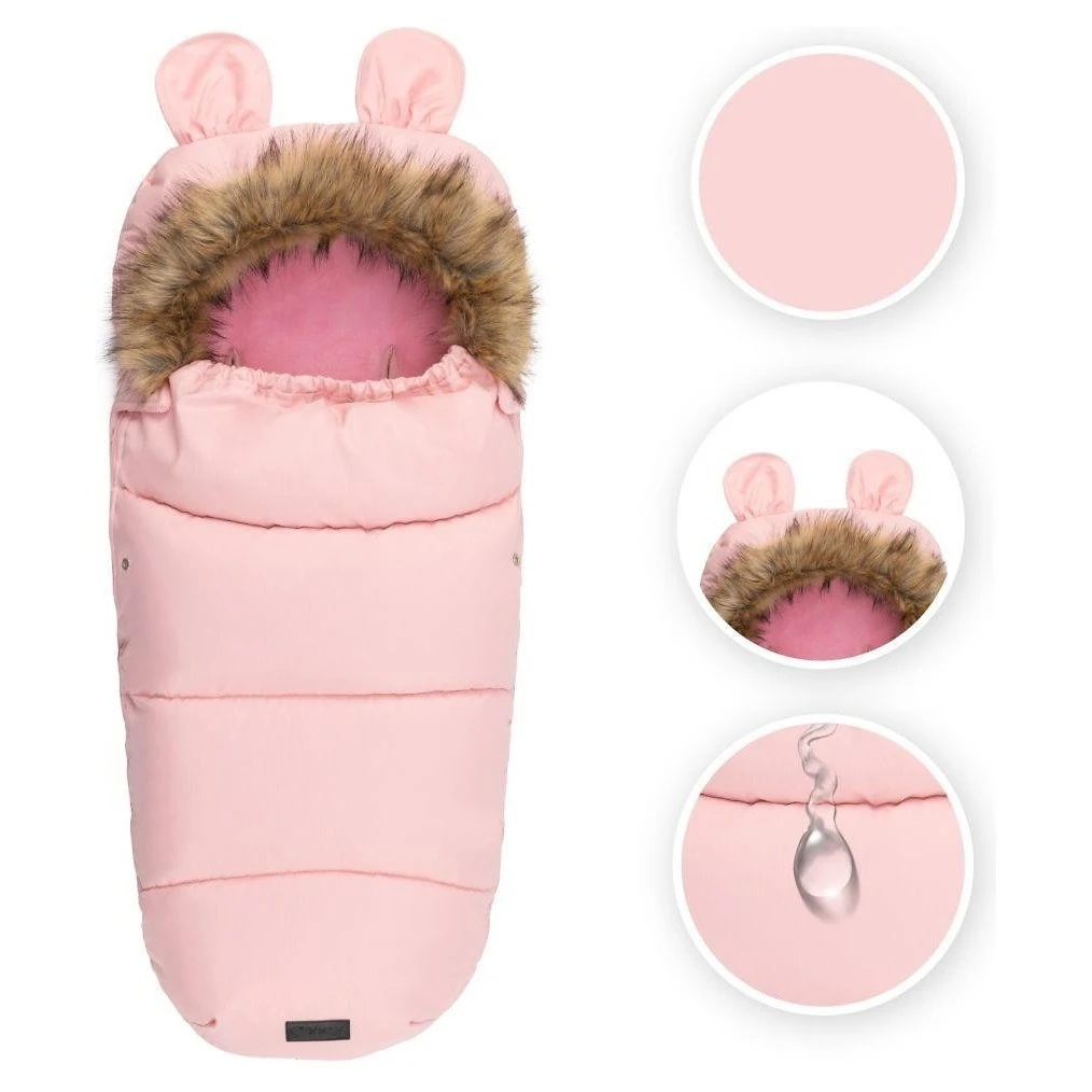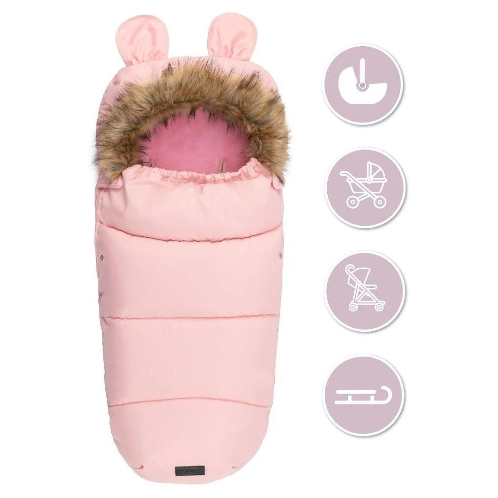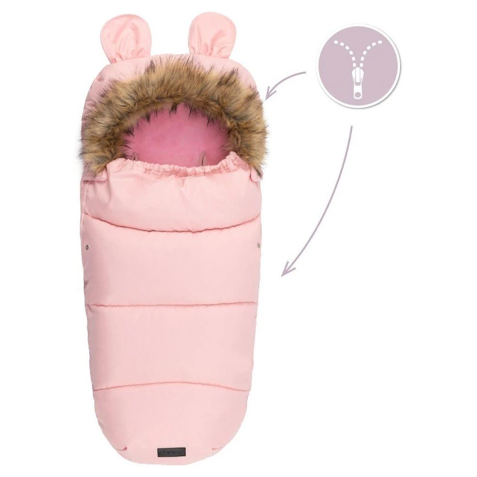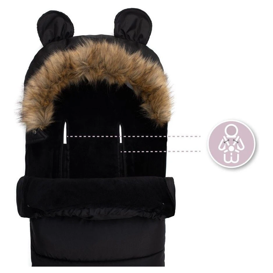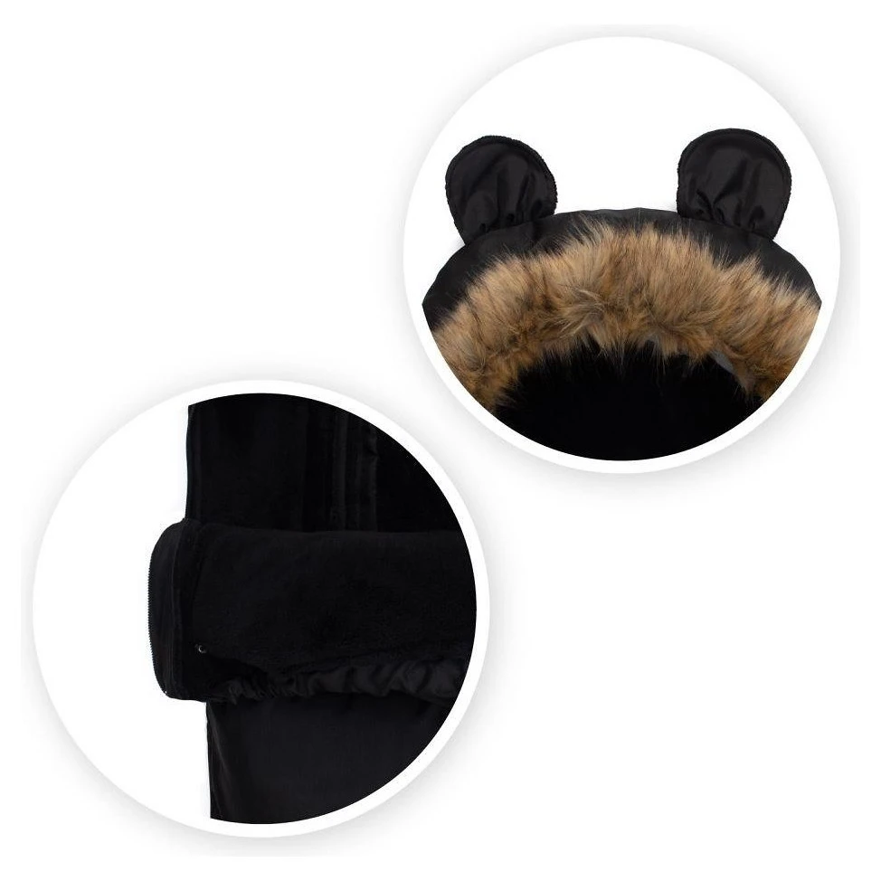 Kapuce fusaku je vybavena roztomilými oušky a je zakončena odepínacím kožešinovým lemem, což umožňuje snadnou údržbu a přizpůsobení vzhledu podle vašich preferencí. Otvory pro pásy jsou kompatibilní s 3 i 5bodovými bezpečnostními pásy, což zajišťuje bezpečné a stabilní upevnění fusaku v kočárku či autosedačce.