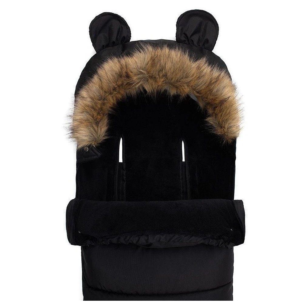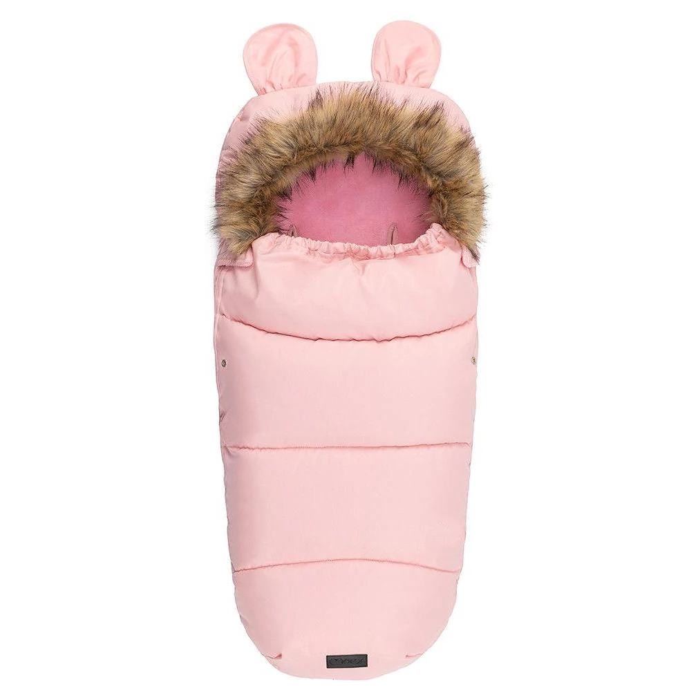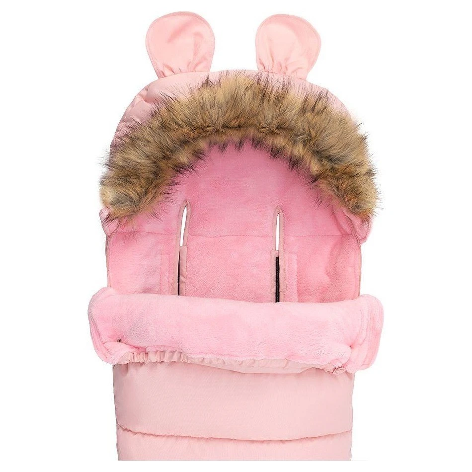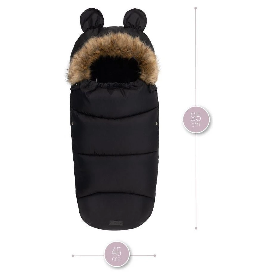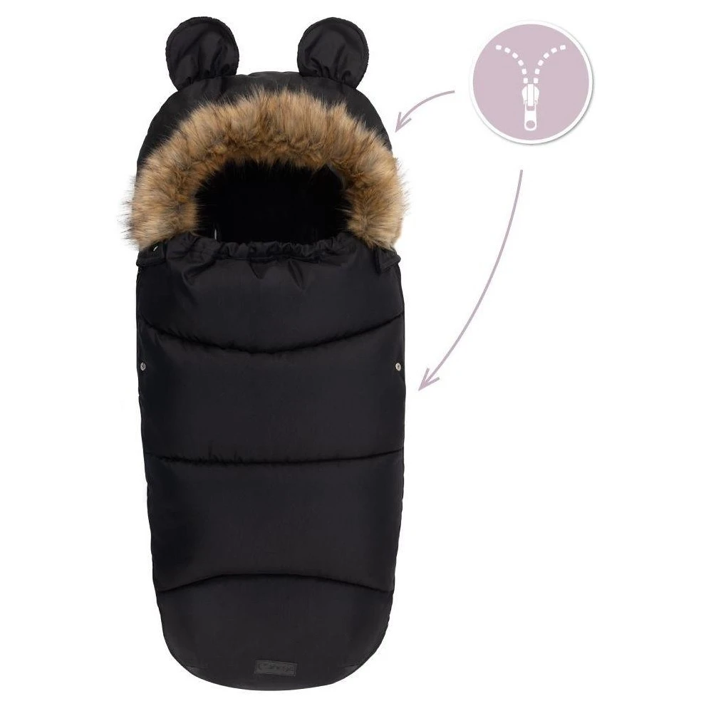 Kapuce fusaku je vybavena roztomilými oušky a je zakončena odepínacím kožešinovým lemem, což umožňuje snadnou údržbu a přizpůsobení vzhledu podle vašich preferencí. Otvory pro pásy jsou kompatibilní s 3 i 5bodovými bezpečnostními pásy, což zajišťuje bezpečné a stabilní upevnění fusaku v kočárku či autosedačce.