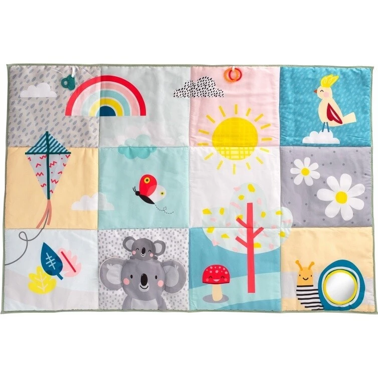 Extrémně velká hrací deka s motivem hravé koaly o rozměru 100 x 150 cm je skvělým místem pro společné chvíle i rozvoj vašeho miminka.Poskytne skvělou izolaci a měkkou podložku, ale i mnoho prvků pro zkoumání. Například bezpečné zrcátko, plastové kroužky, kousátko, různé textury pro rozvoj hmatu i šustící části. Pomáhá tak nenásilně rozvíjet jemnou i hrubou motoriku dítka.