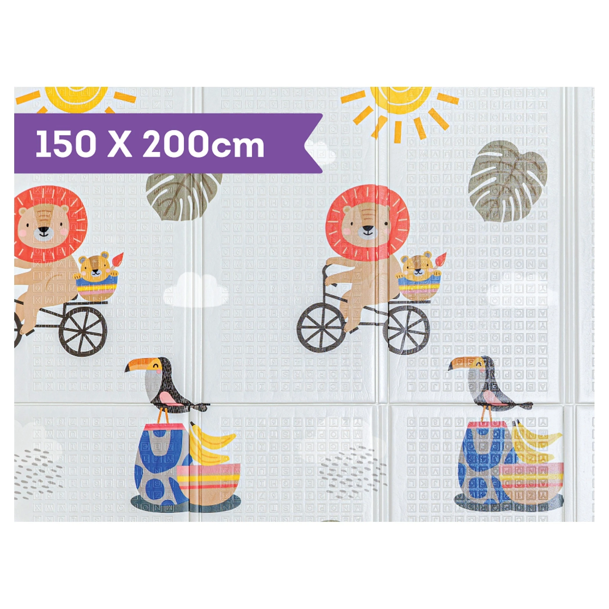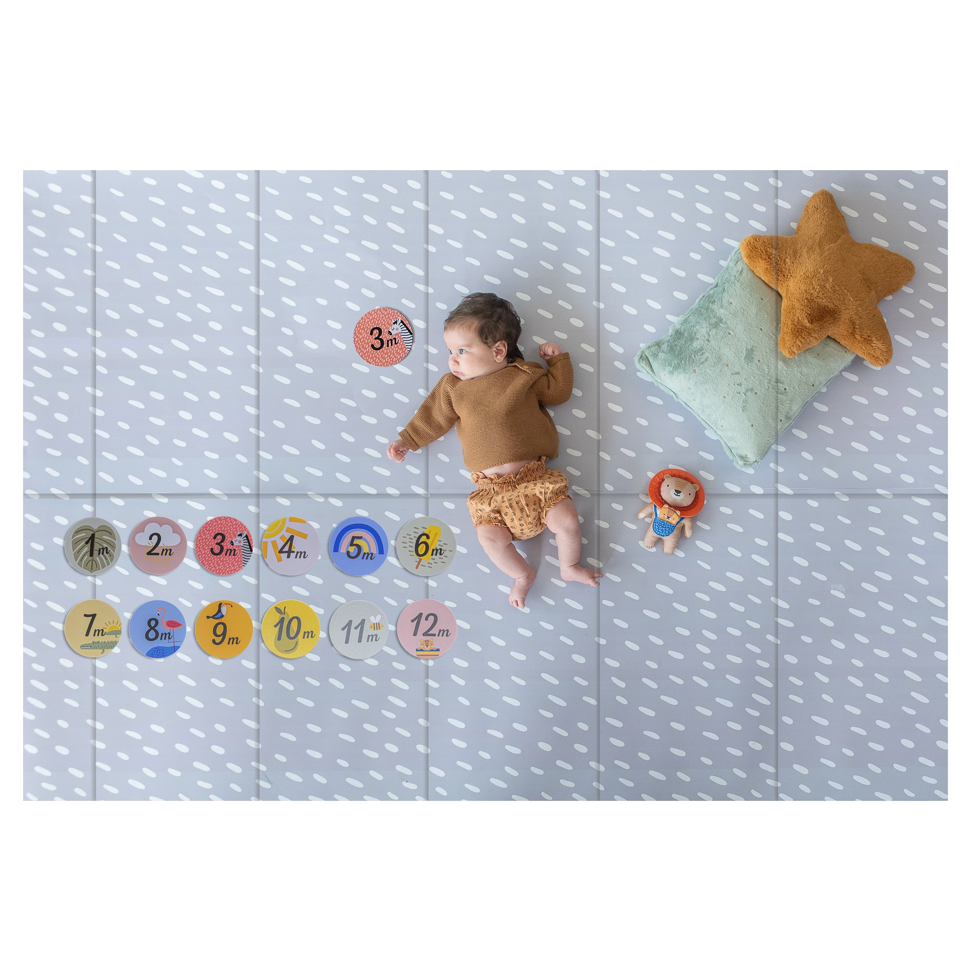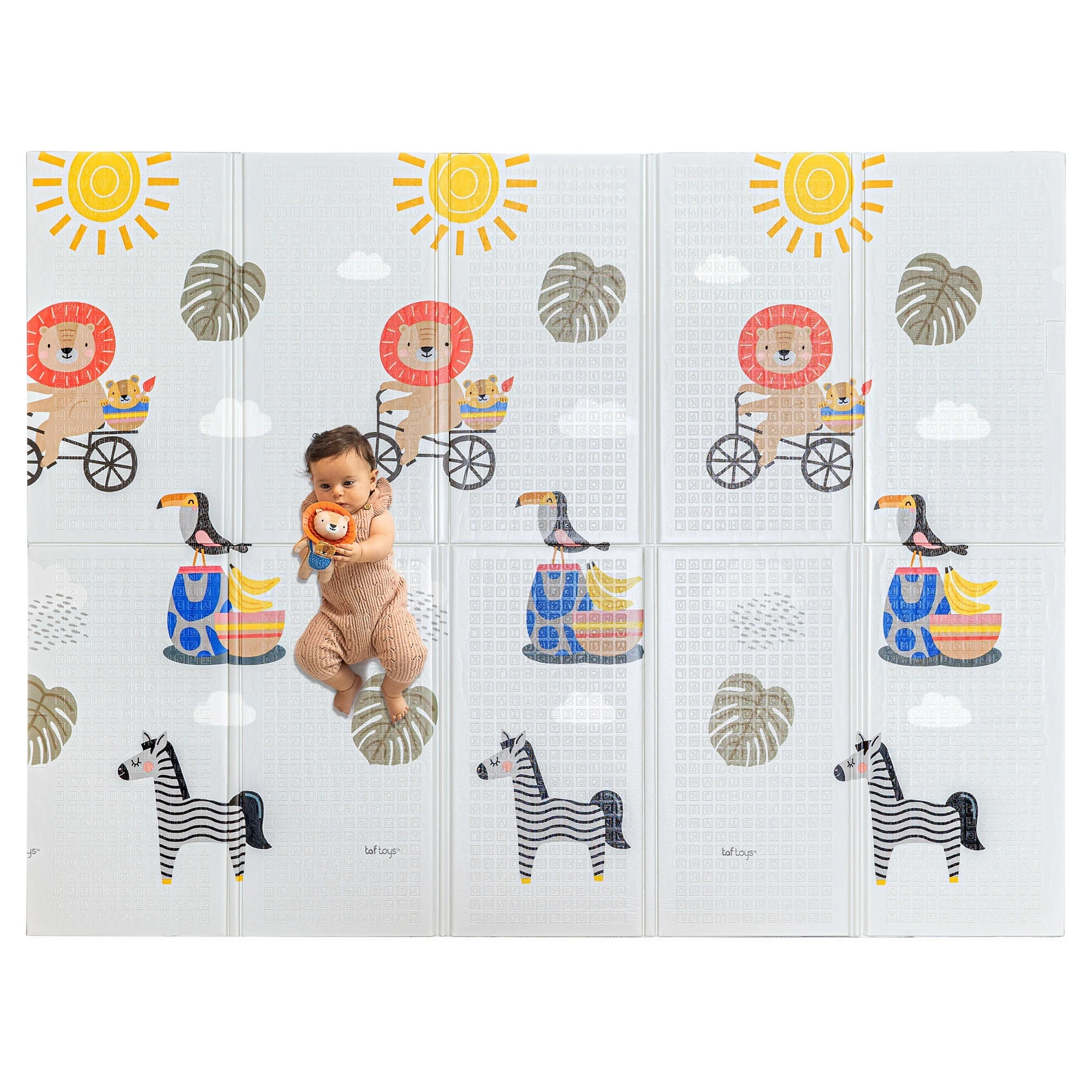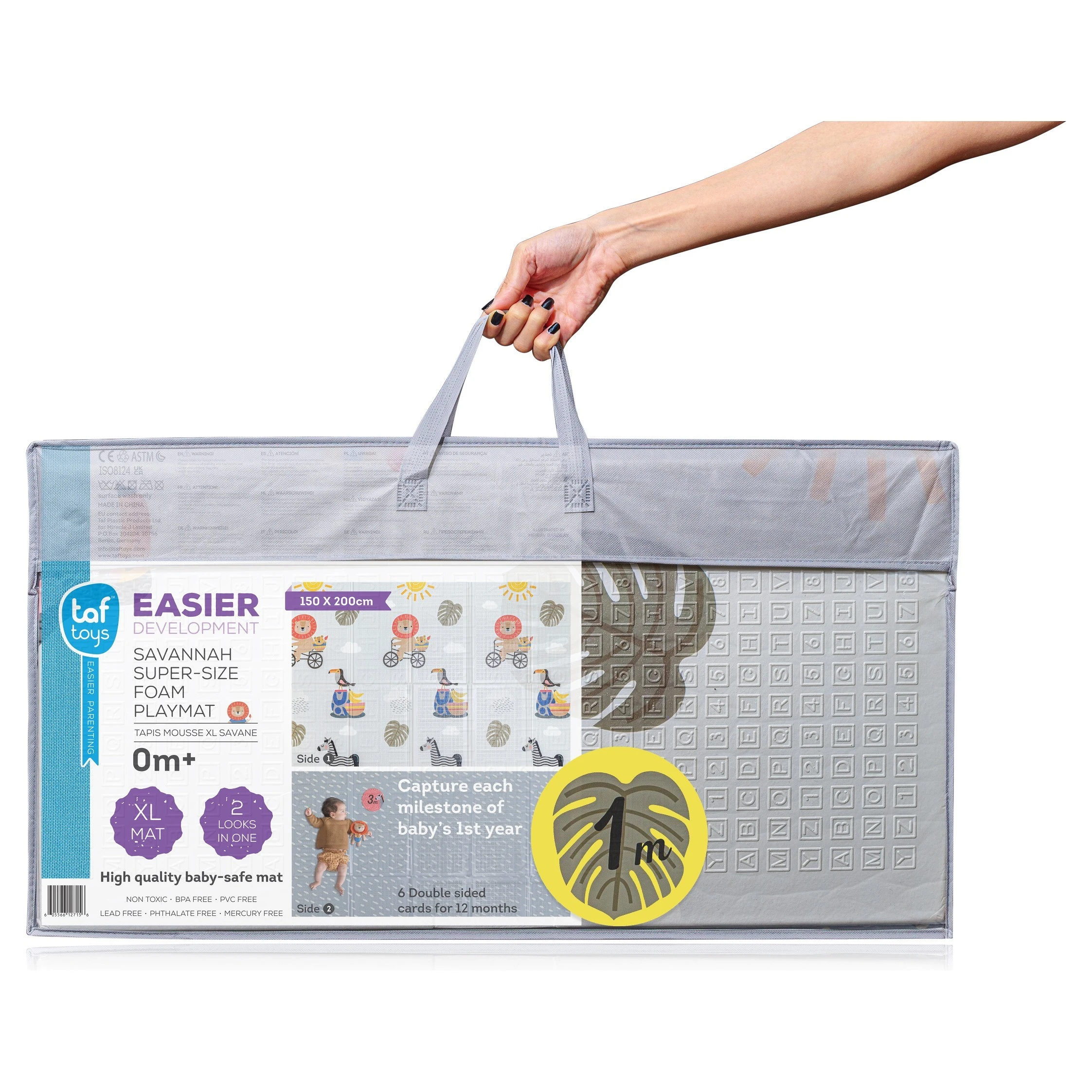 Taf Toys pěnová hrací deka je extra velká podložka, která skvěle izoluje a poskytuje ideální prostor pro hraní. Rozměr podložky je 150 x 200 cm a je voděodolná.Oboustranné provedení nabízí možnost 2 designů. Součástí je i 12 kartiček s měsíci, se kterými si můžete originálně zaznamenat na fotografiích první rok vašeho dítka.