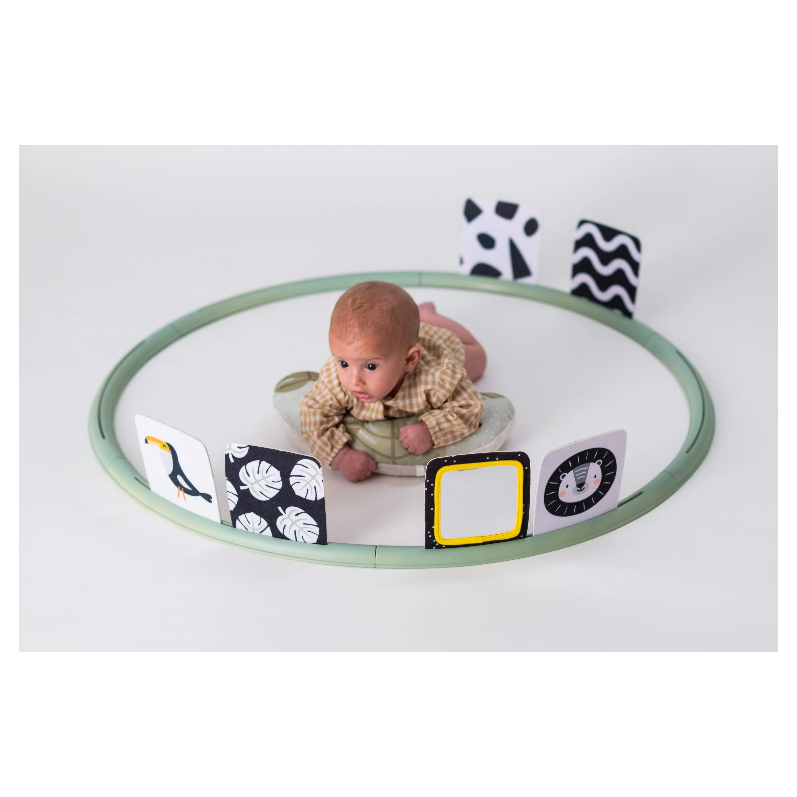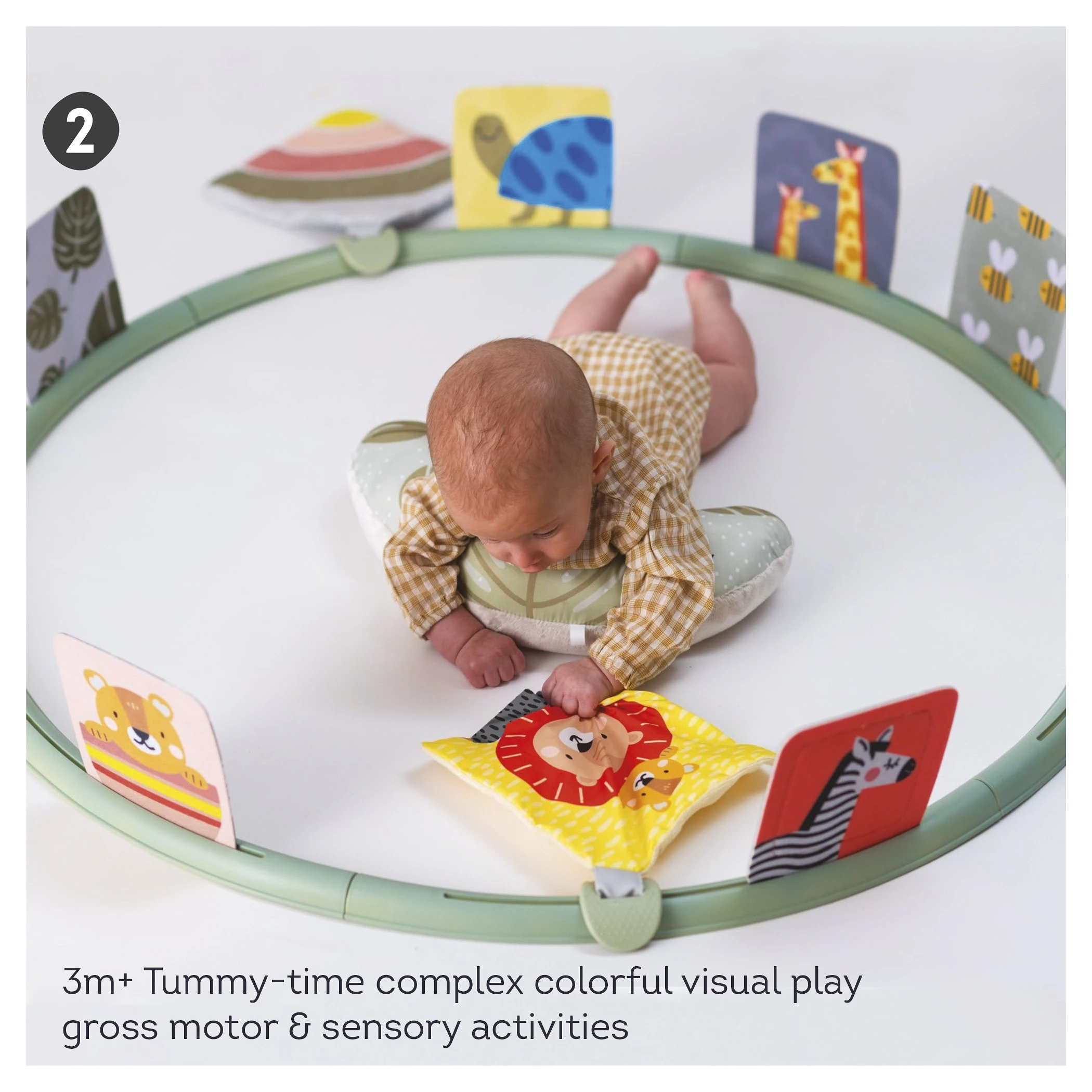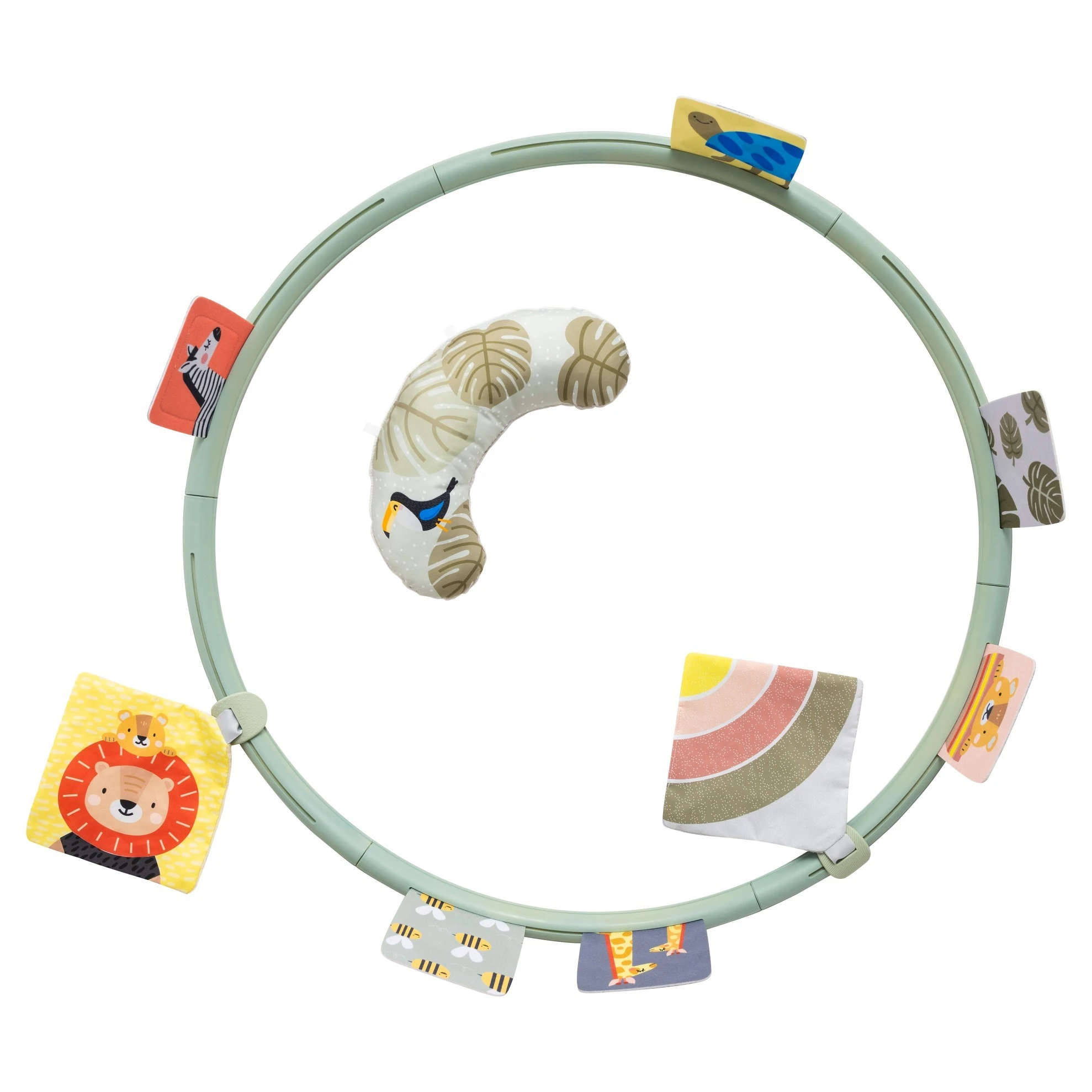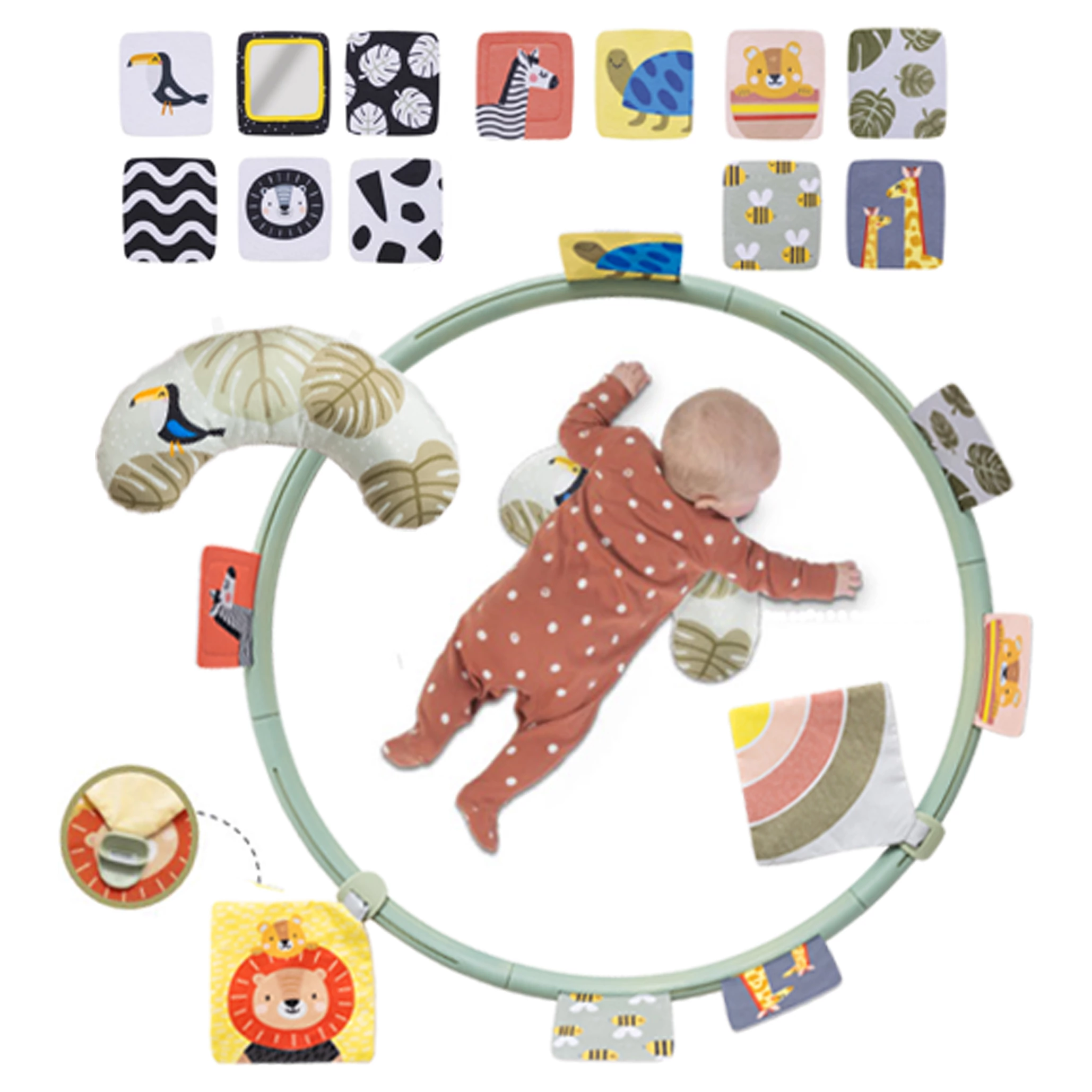 Hrací kruh je skvělý pro děti a jeji podporu rozvoje při hře na bříšku. Díky 16 různým prvkům mají stále co zkoumat a vydrží na bříšku déle. Kruh je velmi skladný, protože je možné jej rozložit na několik částí.Do otvorů můžete připevnit libovolné kombinace aktivit, a tak vytvoříte vždy nové a neokoukané prostředí. Polštářek z měkkého materiálu je navržený tak, aby podporoval hraní dítka na bříšku. Hra na bříšku podporuje posílení krčních a zádových svalů.