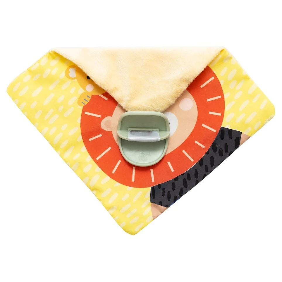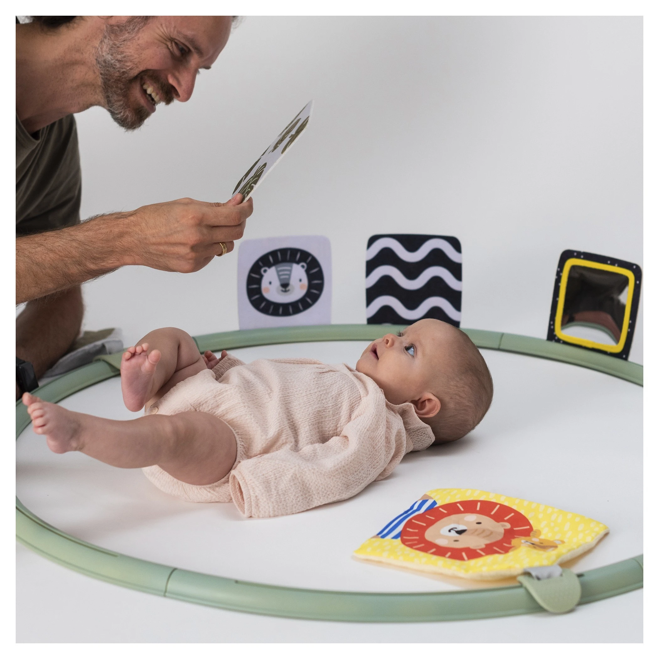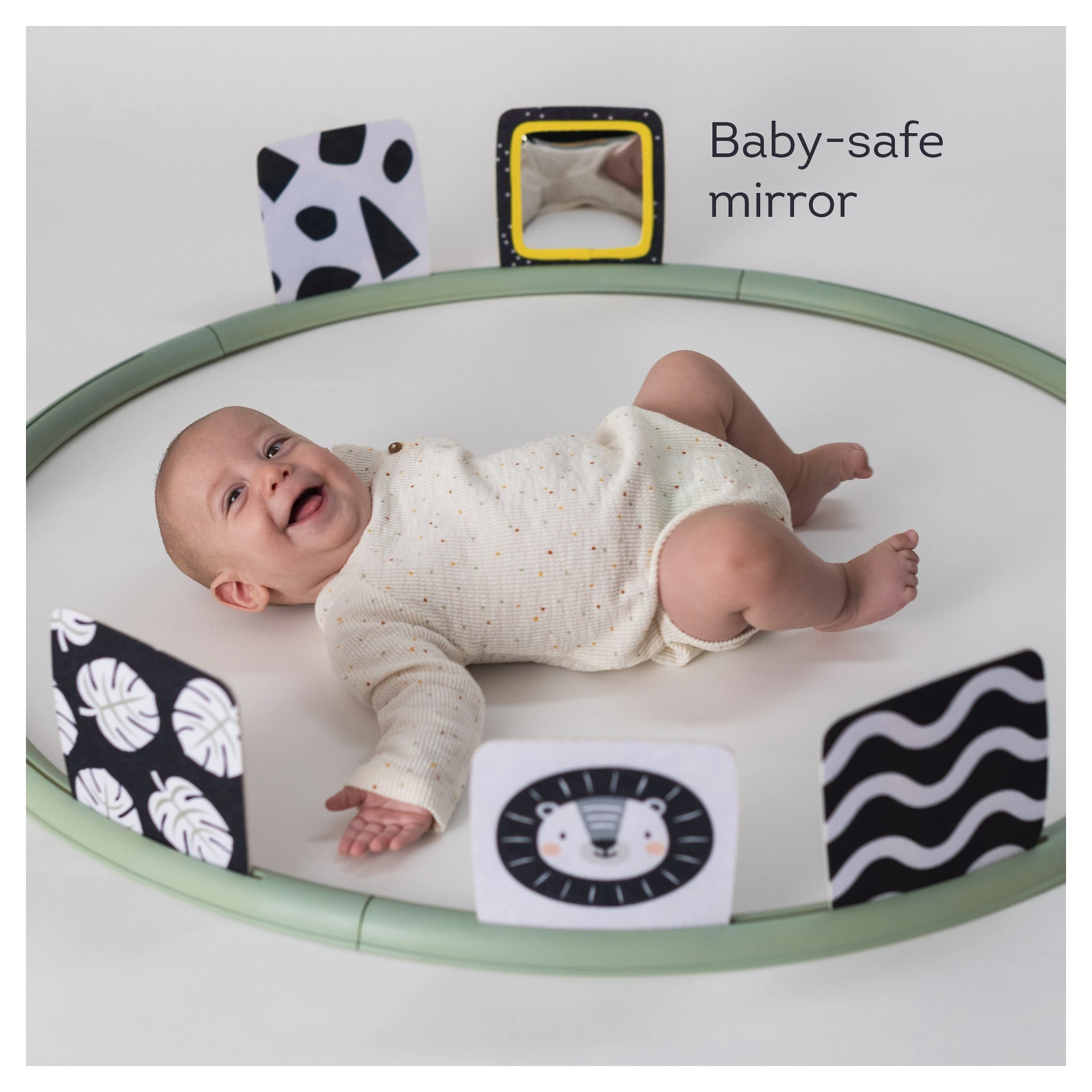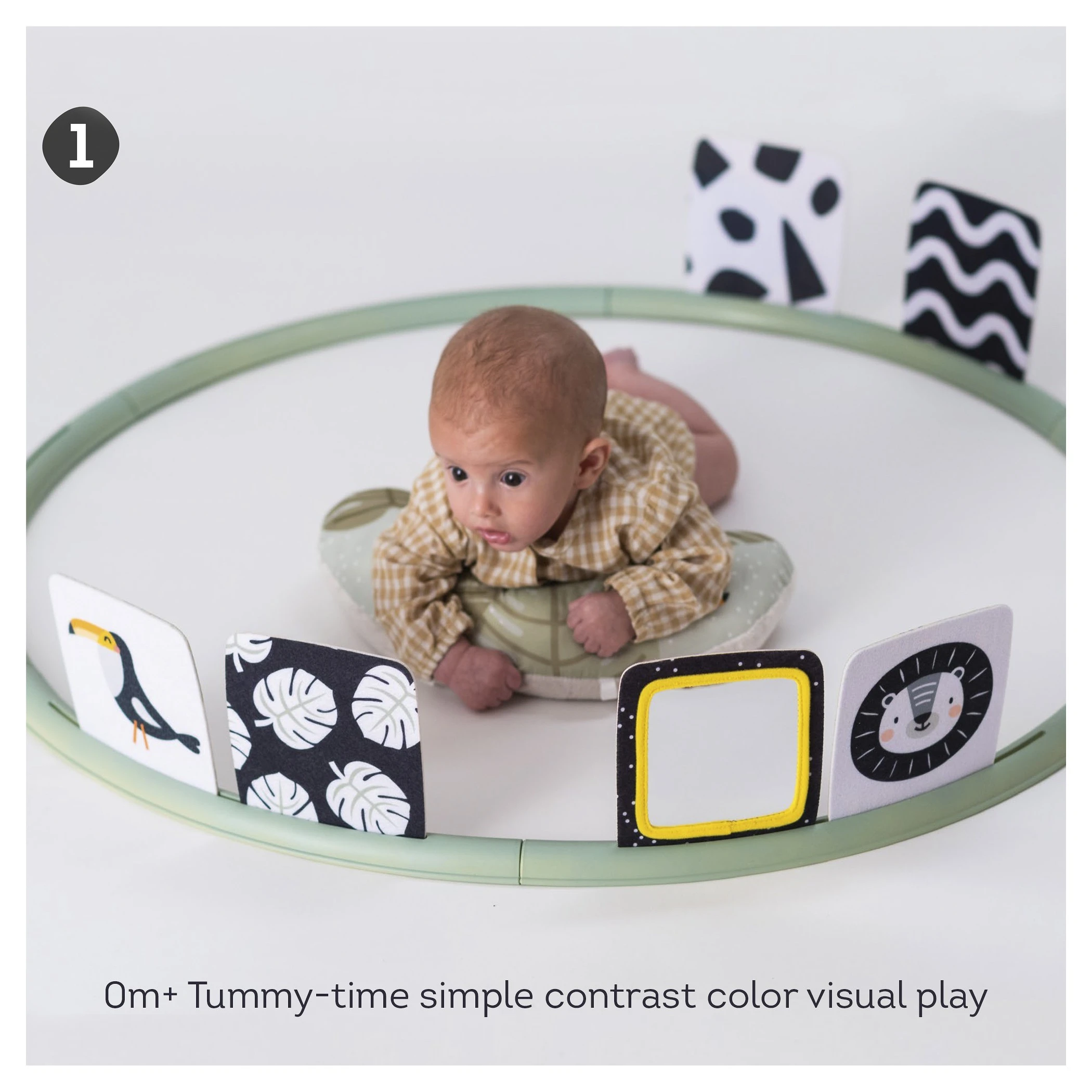 Sada obsahuje speciálně navržené aktivity pro dvě vývojová stádia dítěte. Pro miminko od narození jsou určeny vysoce kontrastní obrázky v černo-bílém provedení i bezpečné zrcátko. Pro děti od 3 měsíců jsou určeny obrázky ve výrazných barvách a dva textilní šusticí čtverce s různými obrázky a texturami pro zkoumání.