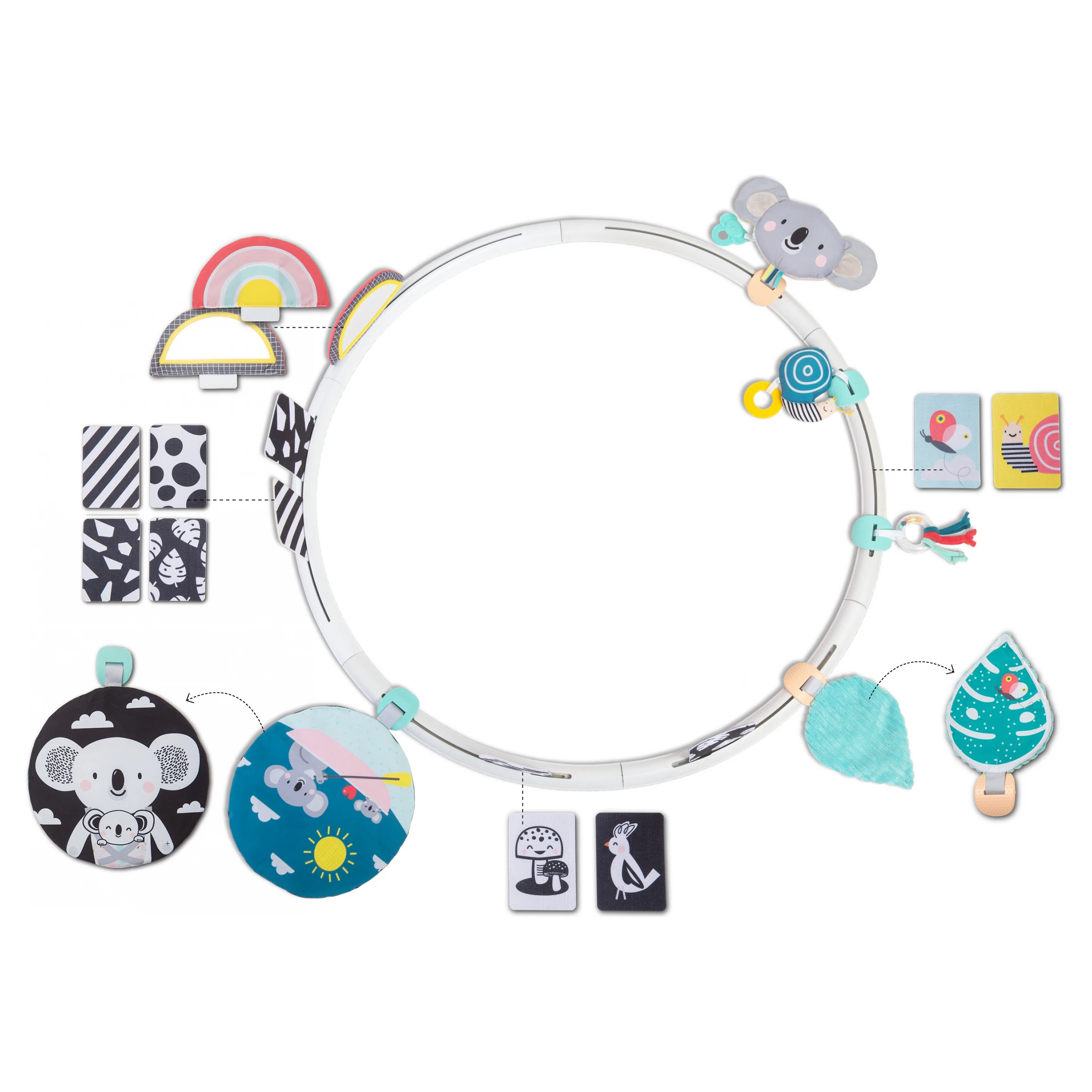 Hrací kruh je složen z několika dílů, které lze snadno a rychle spojit. Do otvorů v kruhu můžete připevnit libovolné kombinace aktivit, čímž vytvoříte vždy nové herní prostředí přizpůsobené aktuálním potřebám a zájmům vašeho dítěte. Tato variabilita zajišťuje, že hračka poroste spolu s vaším dítětem a bude ho bavit po dlouhou dobu.