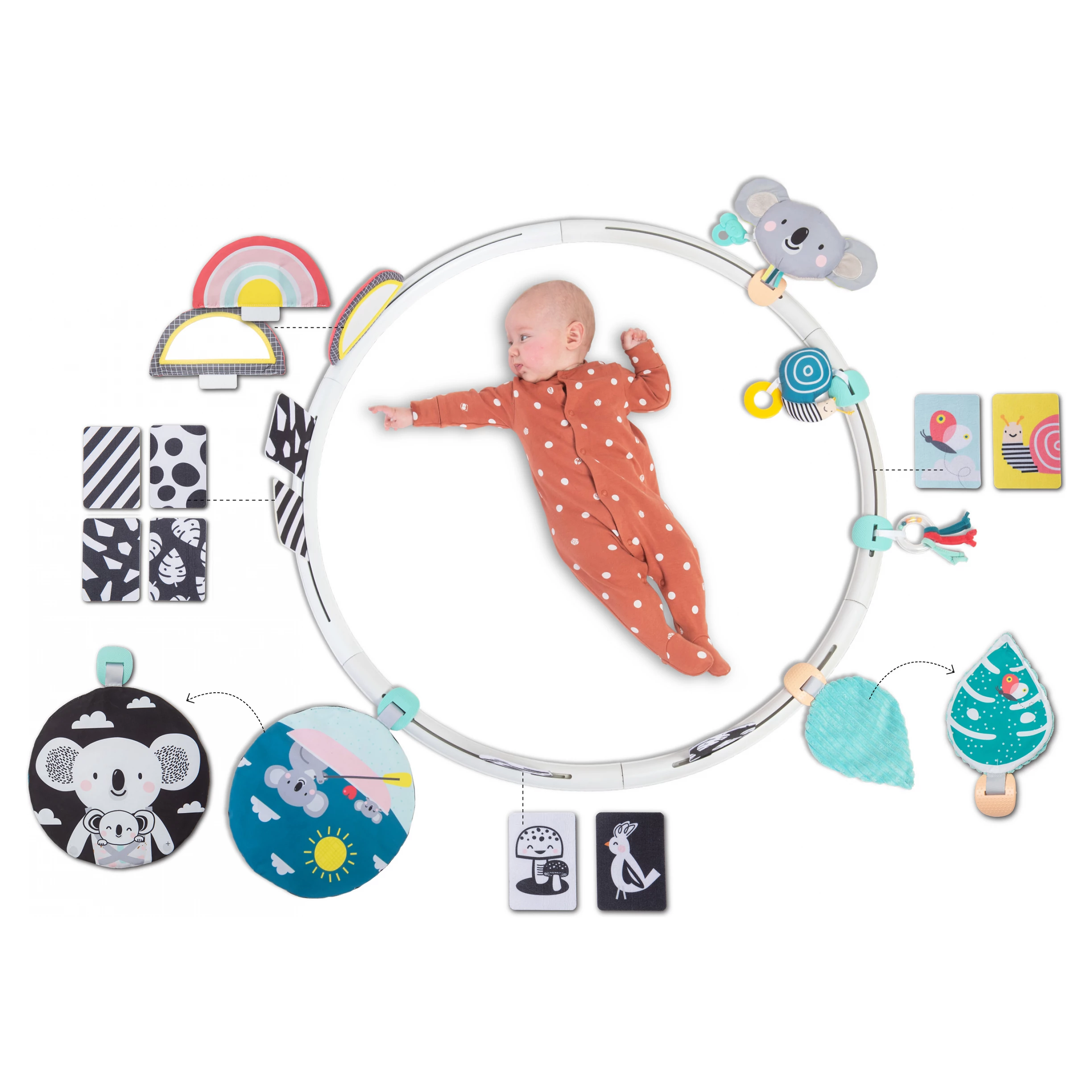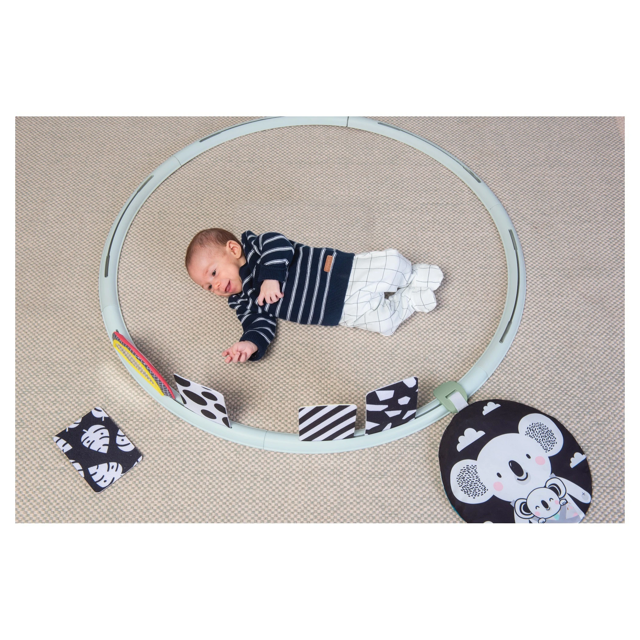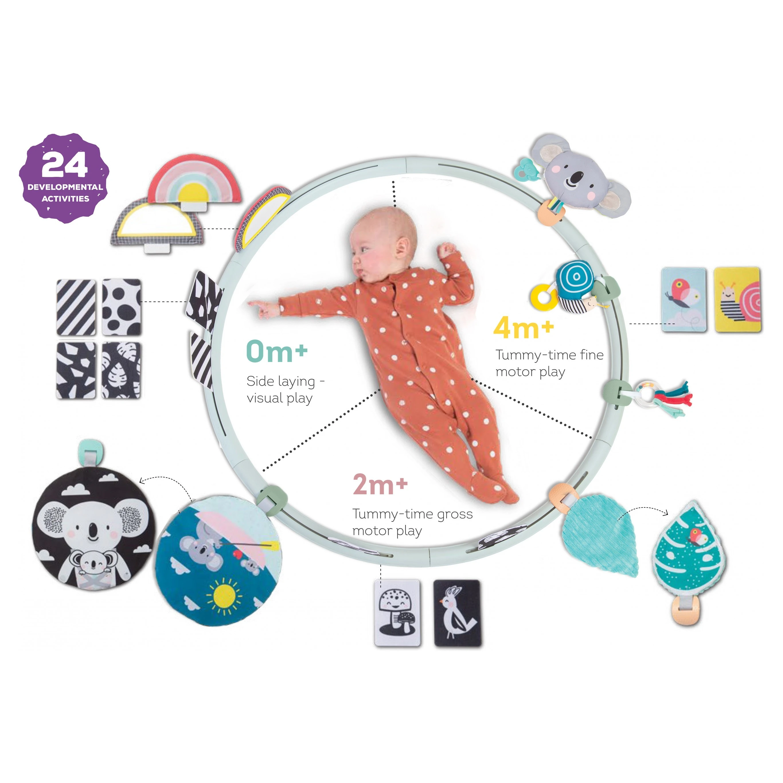 Taf Toys Hrací kruh s aktivitami All Around Me je inovativní herní podložka navržená pro podporu vývoje vašeho dítěte od narození. Tento hrací kruh nabízí 24 různých aktivit, které stimulují smyslové vnímání a motorické dovednosti v různých fázích růstu.Pro novorozence jsou určeny vysoce kontrastní černobílé obrázky a bezpečné zrcátko, které podporují zrakový vývoj. Od 2 měsíců věku dítěte přicházejí na řadu šustící prvky a barevné obrázky, které stimulují sluch a zrak. Pro děti od 4 měsíců jsou připraveny různorodé textury, pískací a chrastící hračky, které podporují hmatové vnímání a jemnou motoriku.