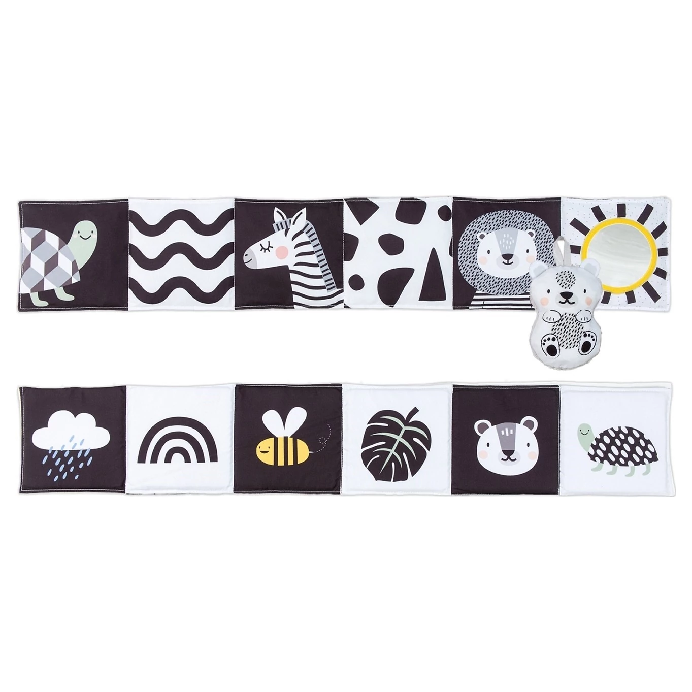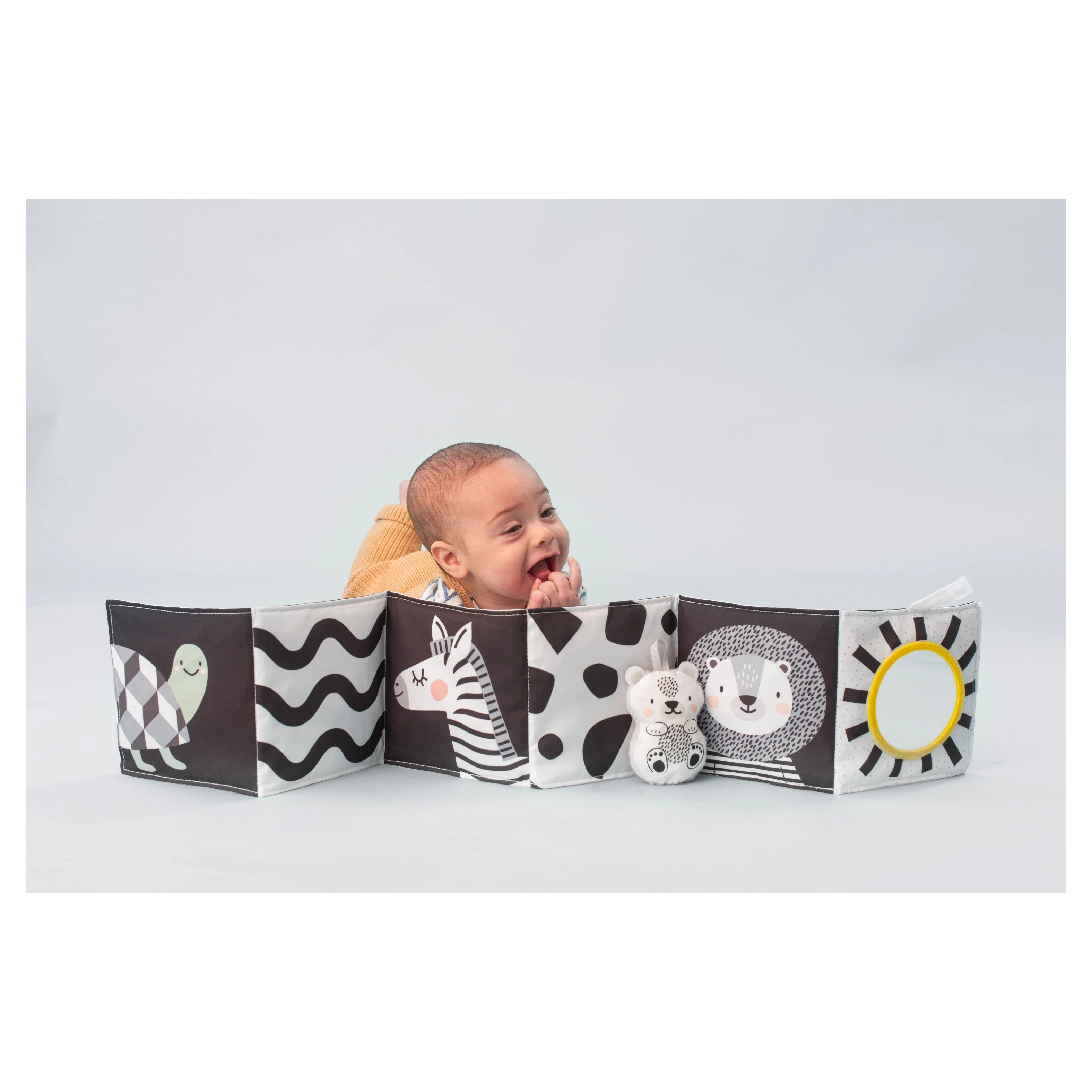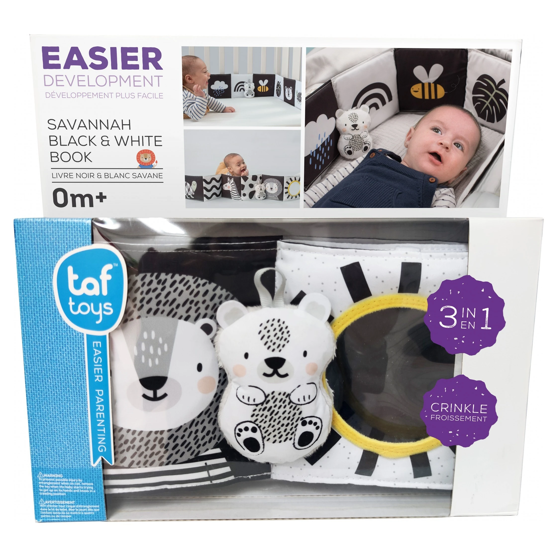 Taf Toys knížka pro nejmenší Savana je oboustranné textilní leporelo navržené speciálně pro nejmenší děti, které podporuje jejich smyslový a motorický vývoj. Díky svému promyšlenému designu je ideální pro použití v postýlce, kočárku i na hrací dece.Knížka nabízí dvě odlišné strany, přizpůsobené různým fázím vývoje dítěte. Knížka je vybavena šustícími stránkami, které při manipulaci vydávají zvuky, čímž upoutávají pozornost dítěte a podporují jeho sluchové vnímání. Součástí je také odnímatelný roztomilý medvídek, který slouží jako mazlíček a další prvek pro zkoumání. Díky praktickým úchytům lze knížku snadno připevnit k postýlce nebo kočárku, což zajišťuje její stabilitu a bezpečnost během používání.