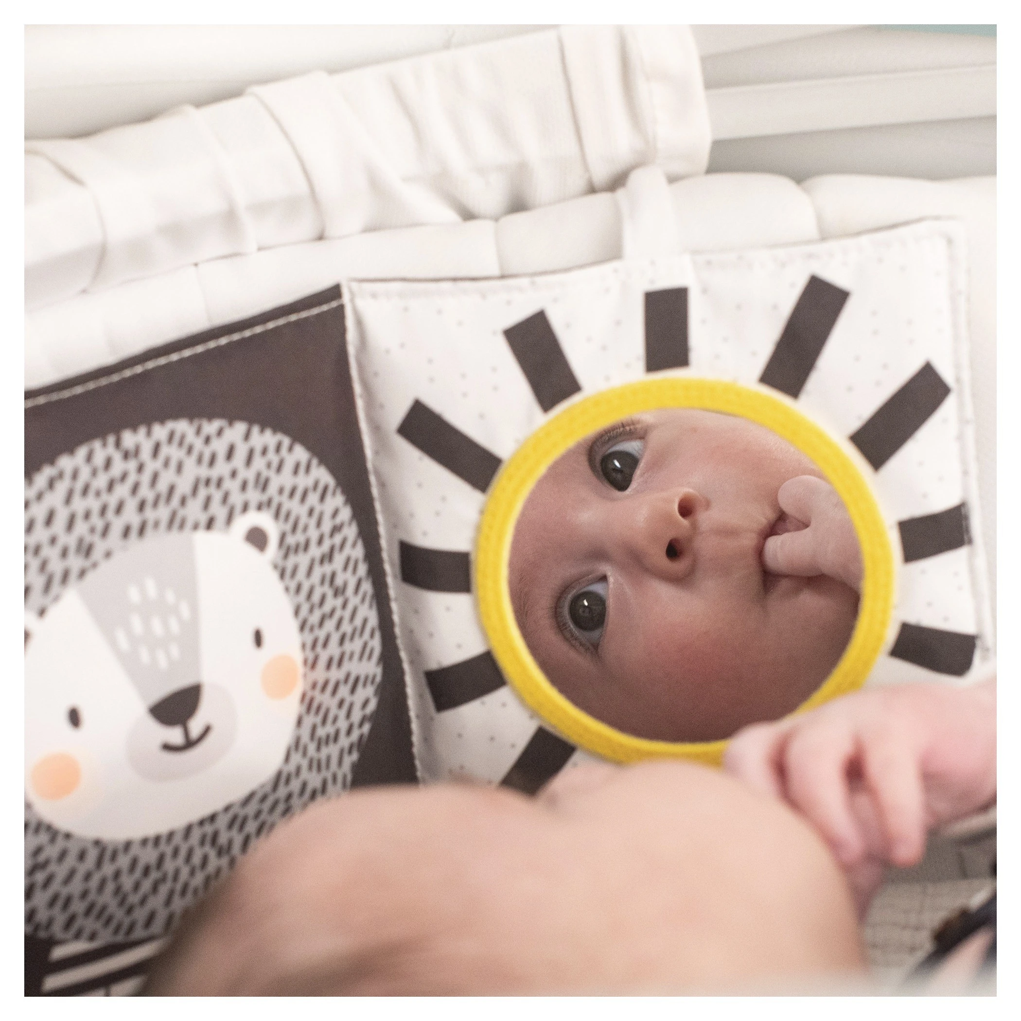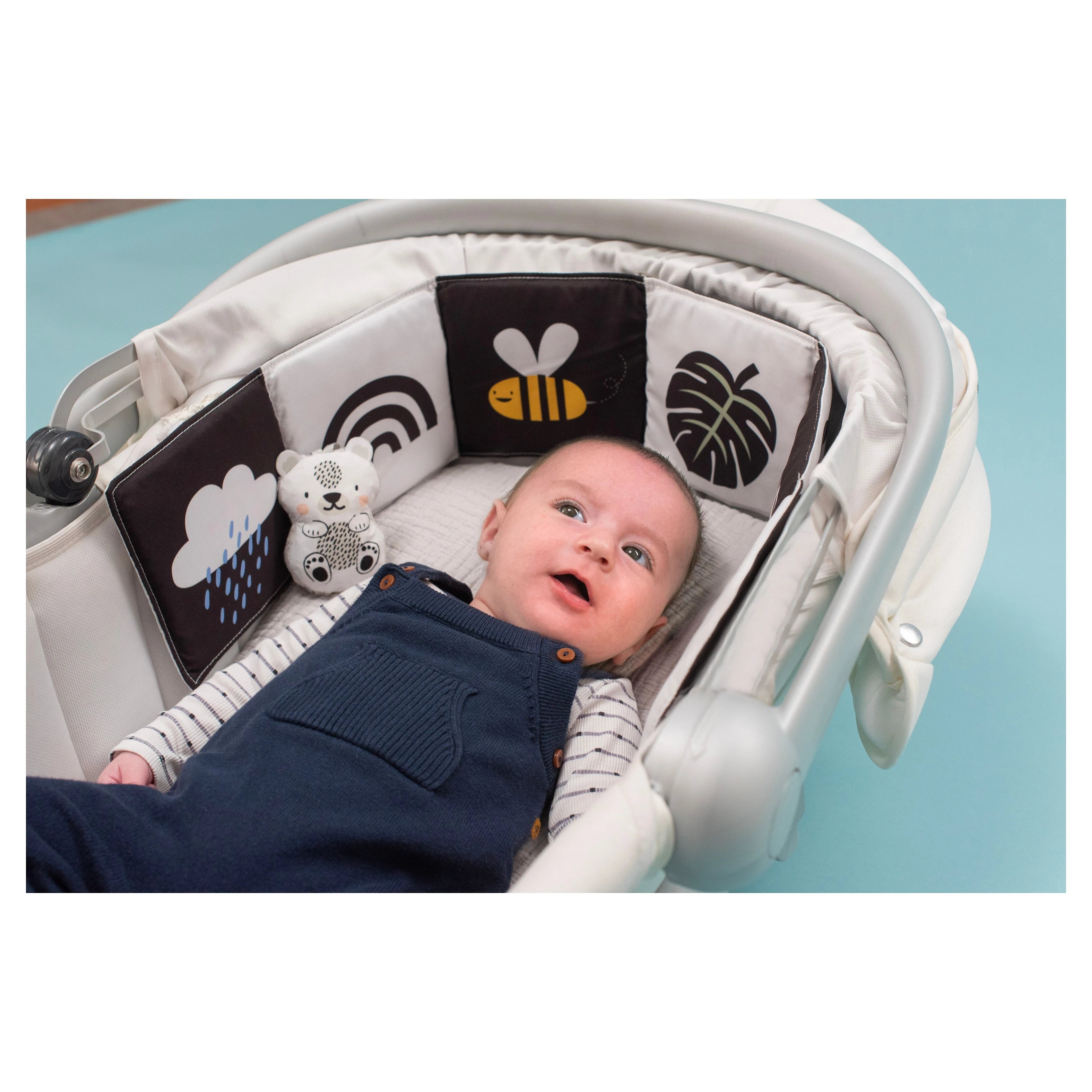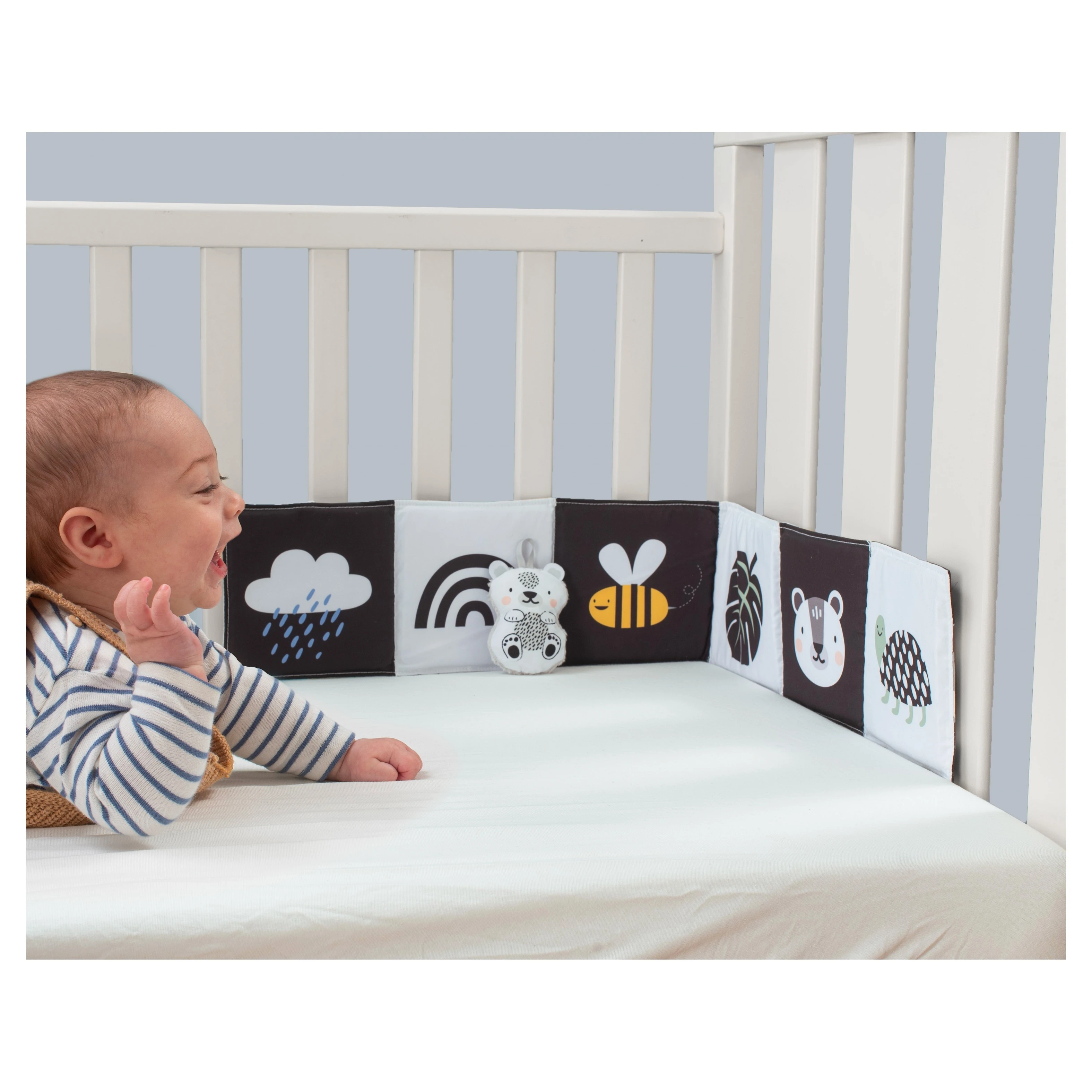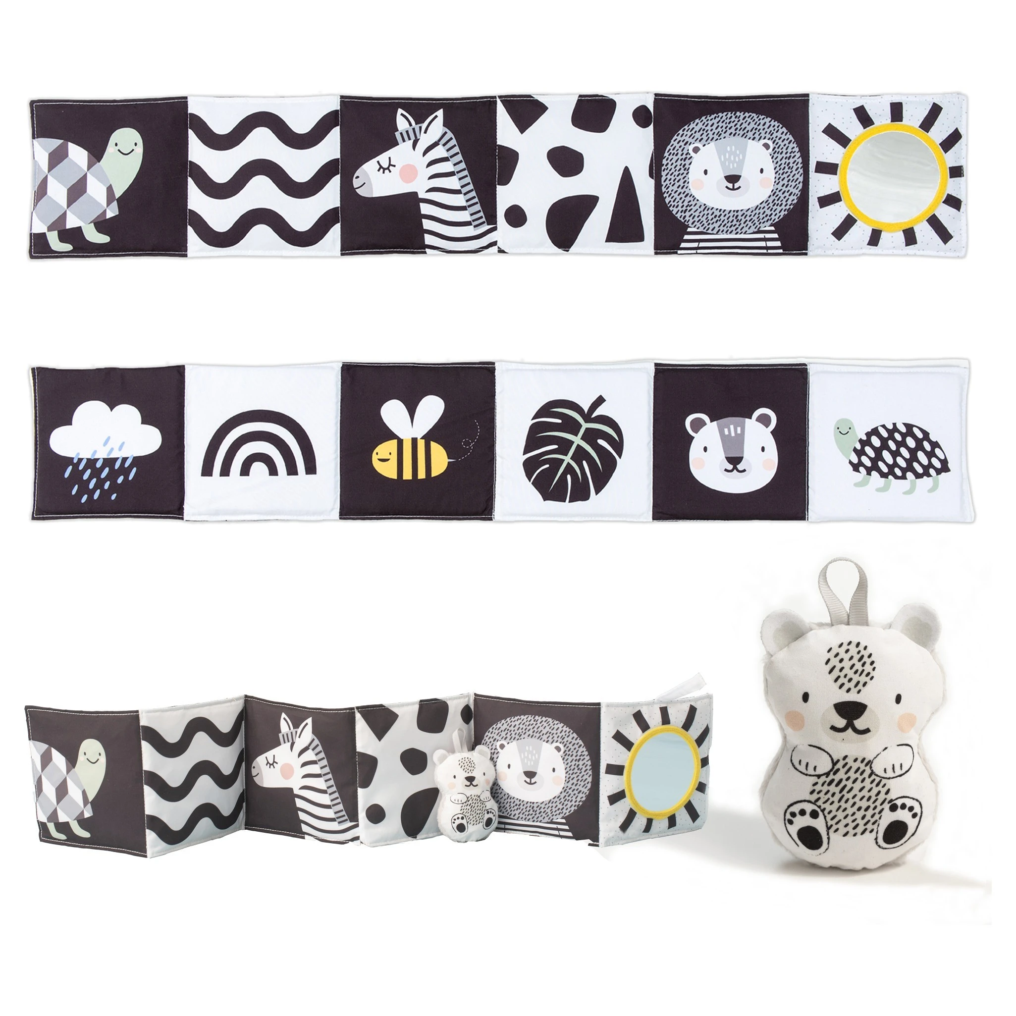 Taf Toys knížka pro nejmenší Savana je oboustranné textilní leporelo navržené speciálně pro nejmenší děti, které podporuje jejich smyslový a motorický vývoj. Díky svému promyšlenému designu je ideální pro použití v postýlce, kočárku i na hrací dece.Knížka nabízí dvě odlišné strany, přizpůsobené různým fázím vývoje dítěte. Knížka je vybavena šustícími stránkami, které při manipulaci vydávají zvuky, čímž upoutávají pozornost dítěte a podporují jeho sluchové vnímání. Součástí je také odnímatelný roztomilý medvídek, který slouží jako mazlíček a další prvek pro zkoumání. Díky praktickým úchytům lze knížku snadno připevnit k postýlce nebo kočárku, což zajišťuje její stabilitu a bezpečnost během používání.
