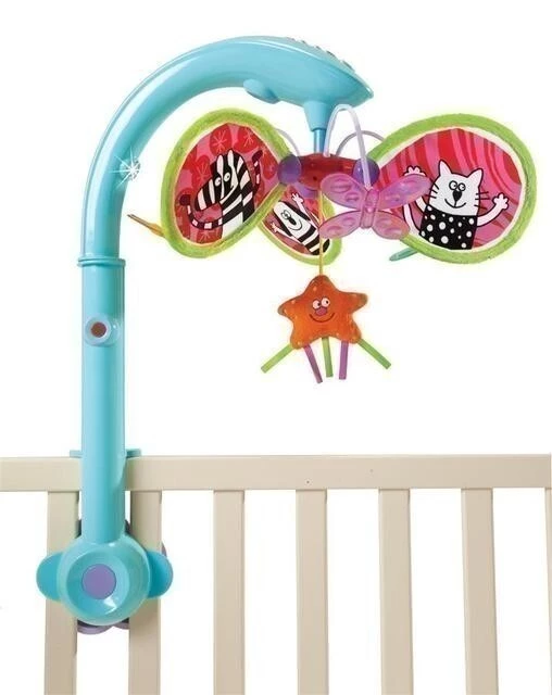 Tři oboustranné zavěšené obrázky jsou určeny pro dvě vývojová stádia dítěte. Vysoce kontrastní barvy pro 0–3m, barevné veselé obrázky pro 3m+.