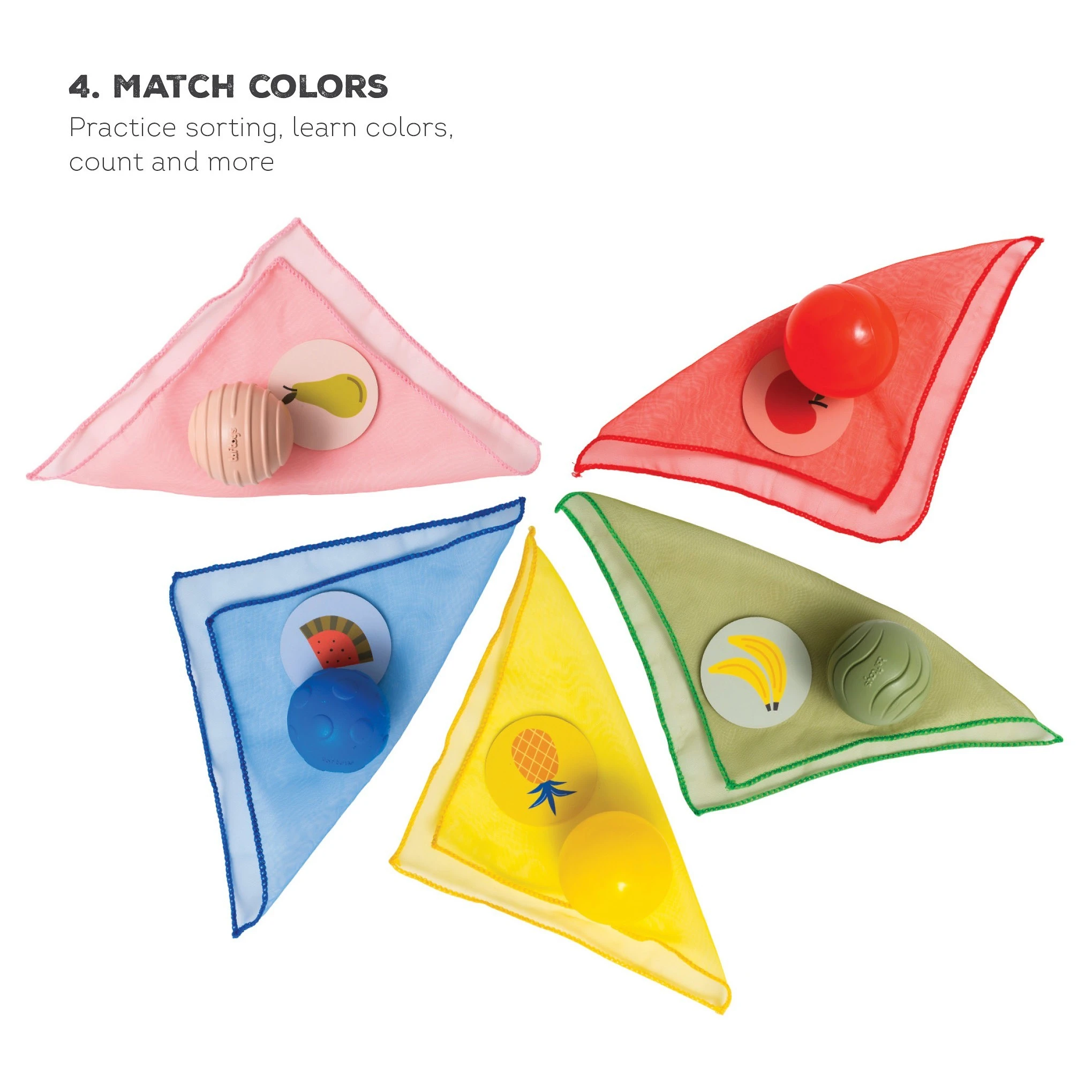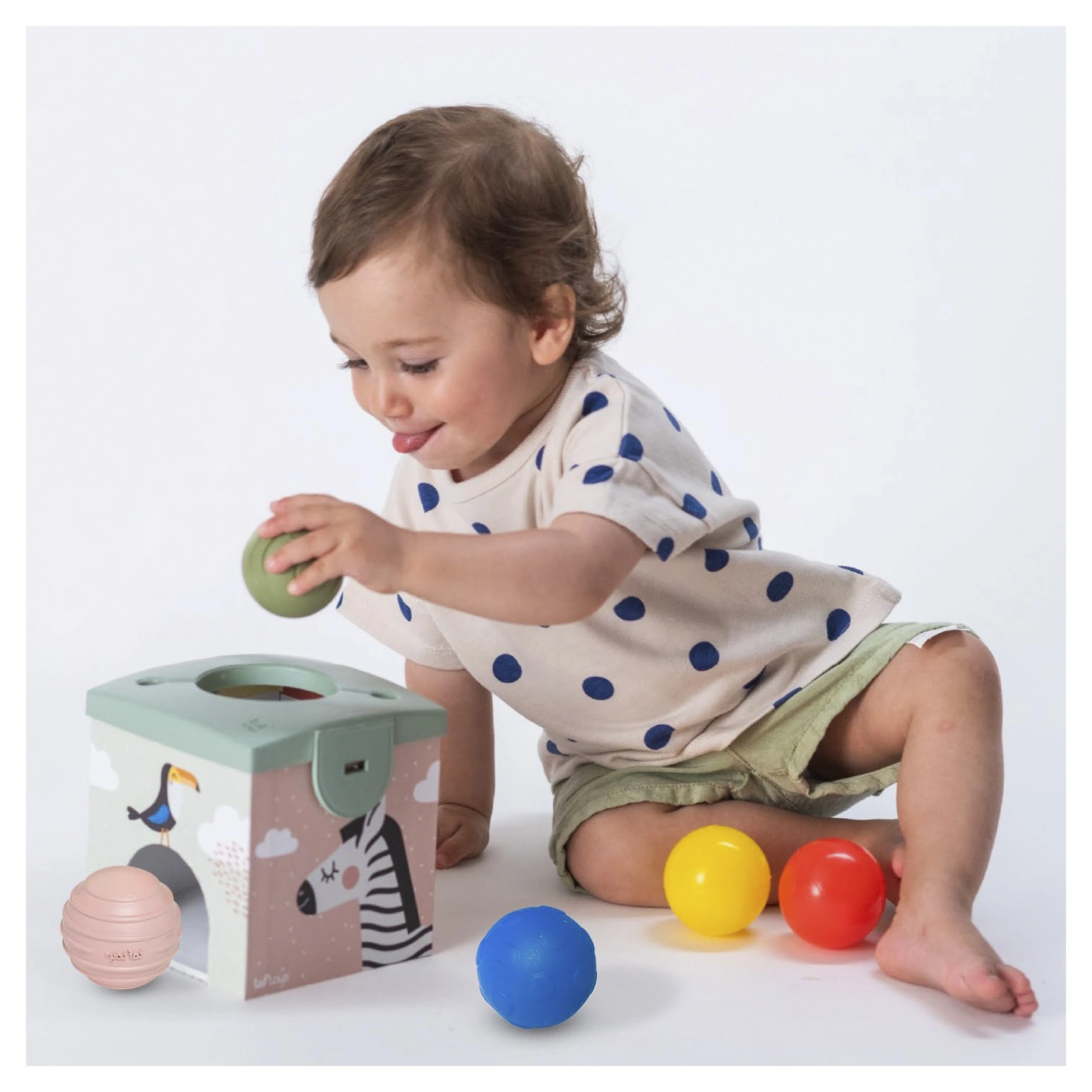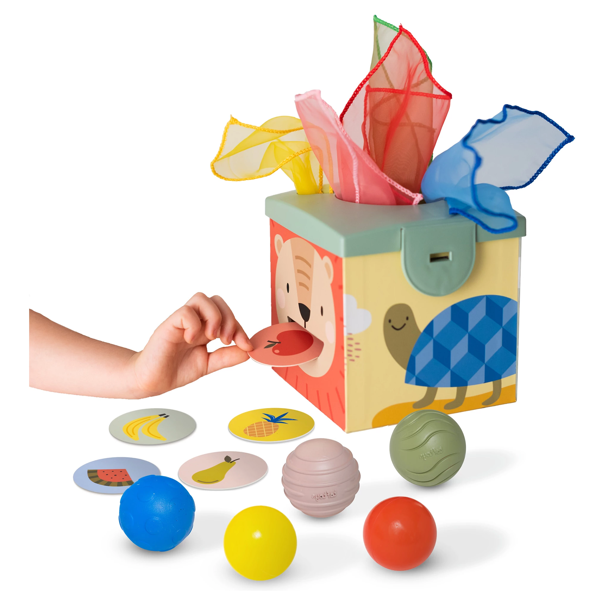 Taf Toys Magic Box je interaktivní hračka navržená pro děti od 12 měsíců, která podporuje jejich motorický a kognitivní vývoj prostřednictvím zábavných aktivit.Tato kouzelná krabice obsahuje 5 šátků z jemné organzy, 5 barevných míčků s různými texturami a 5 oboustranných kartiček s obrázky ovoce. Děti mohou šátky vytahovat z krabice, což rozvíjí jejich jemnou motoriku a smyslové vnímání. Vhazováním míčků do otvoru na krabici a sledováním jejich vykutálení se z bočního otvoru se učí o stálosti objektů a zlepšují koordinaci ruka-oko. Krmením usměvavého medvídka na boku krabice pomocí kartiček s obrázky ovoce děti rozvíjejí svou představivost a emoční inteligenci.