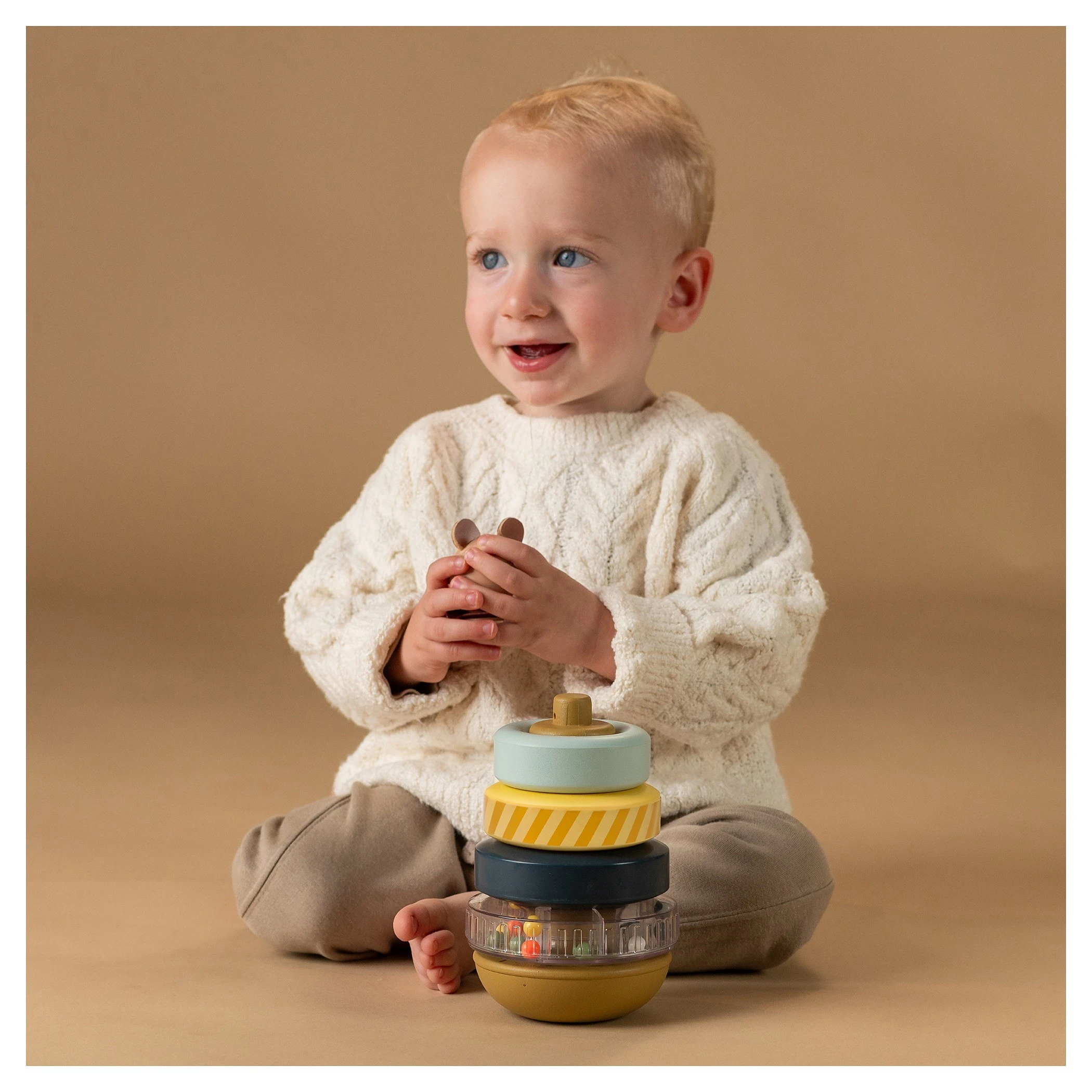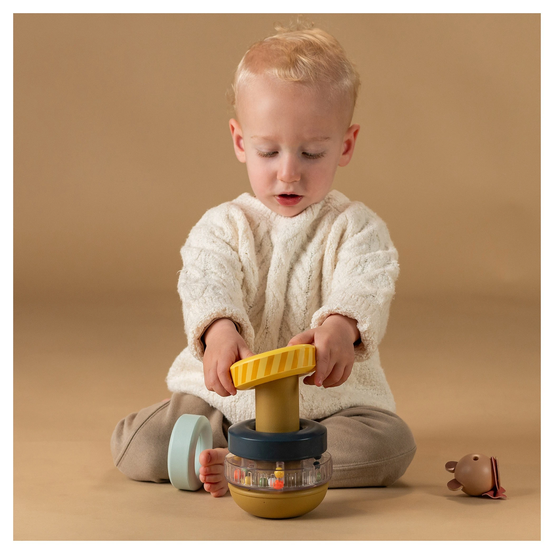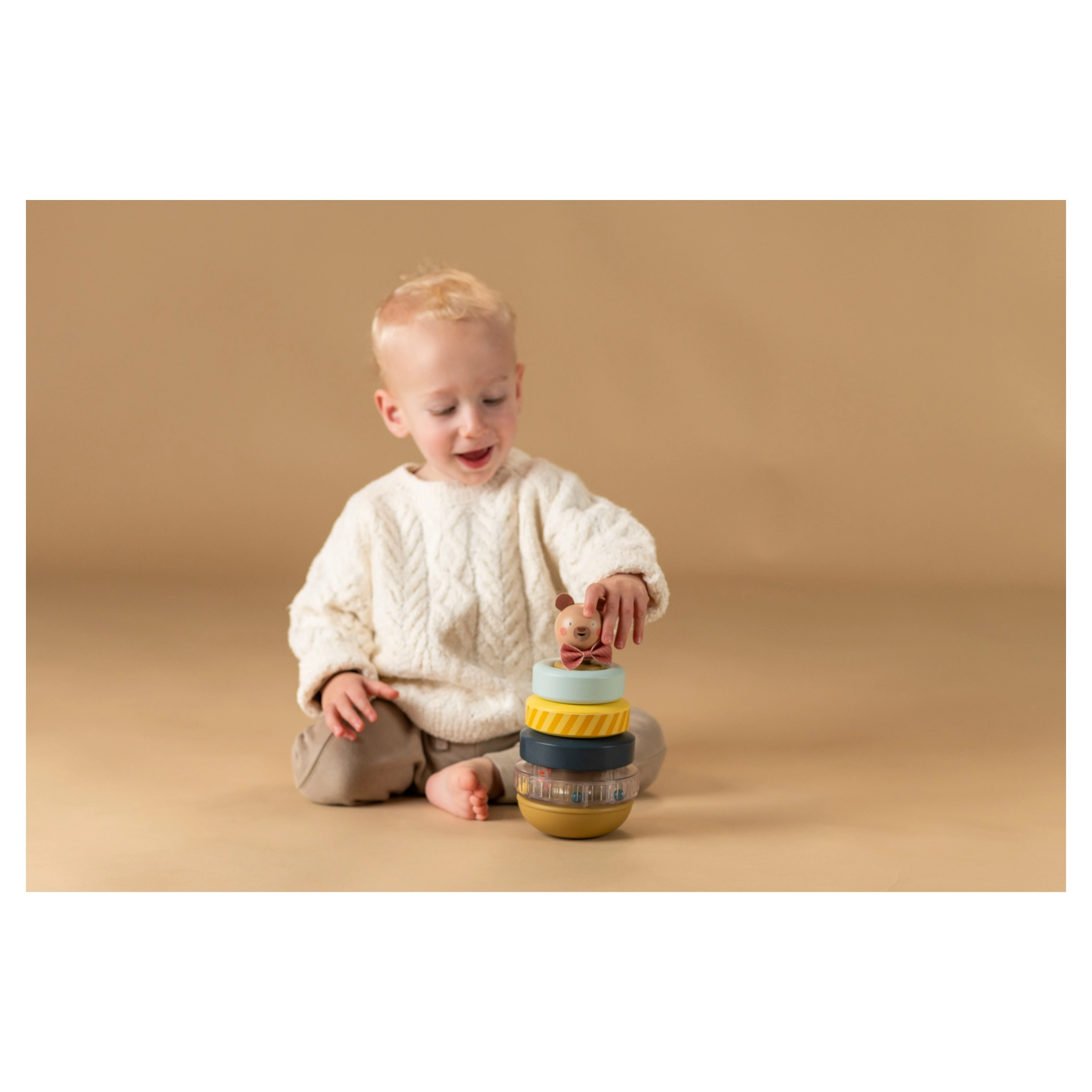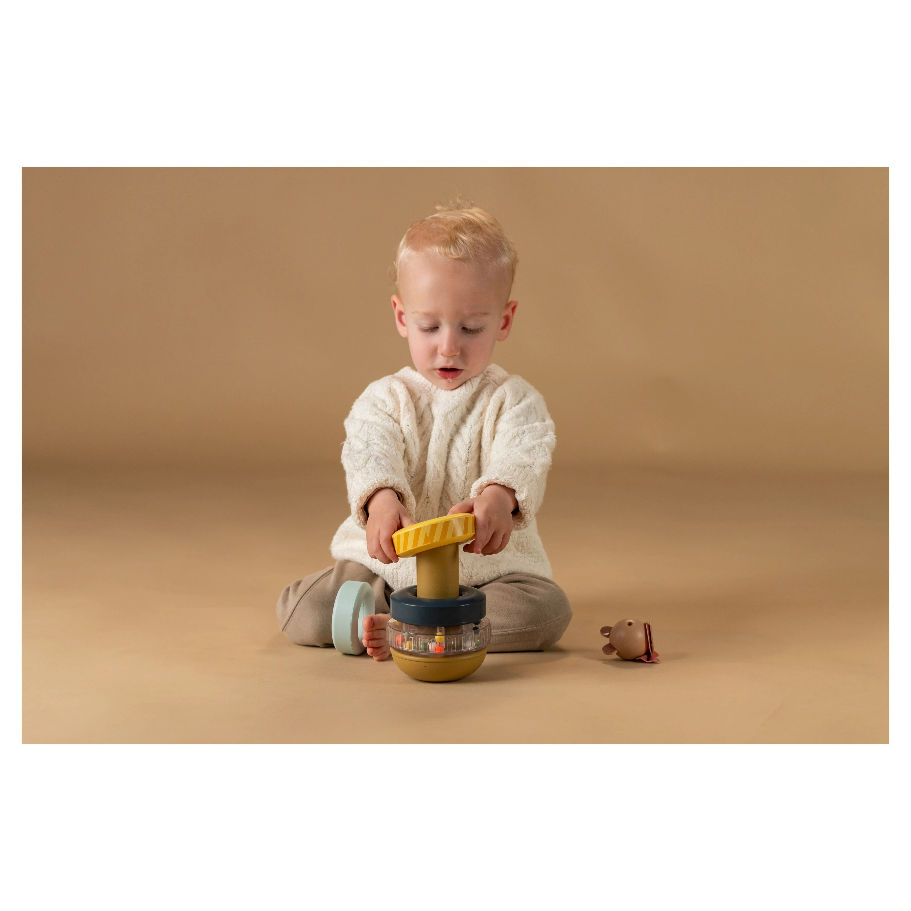 Každý kroužek lze postavit na bok a kutálet po zemi, což podporuje lezení a pohyb dítěte. Stohování kroužků zlepšuje koordinaci oko-ruka a jemnou motoriku. Děti si při skládání trénují řešení problémů a prostorové vnímání. Hračka je ideální pro učení barev, velikostí a pořadí.