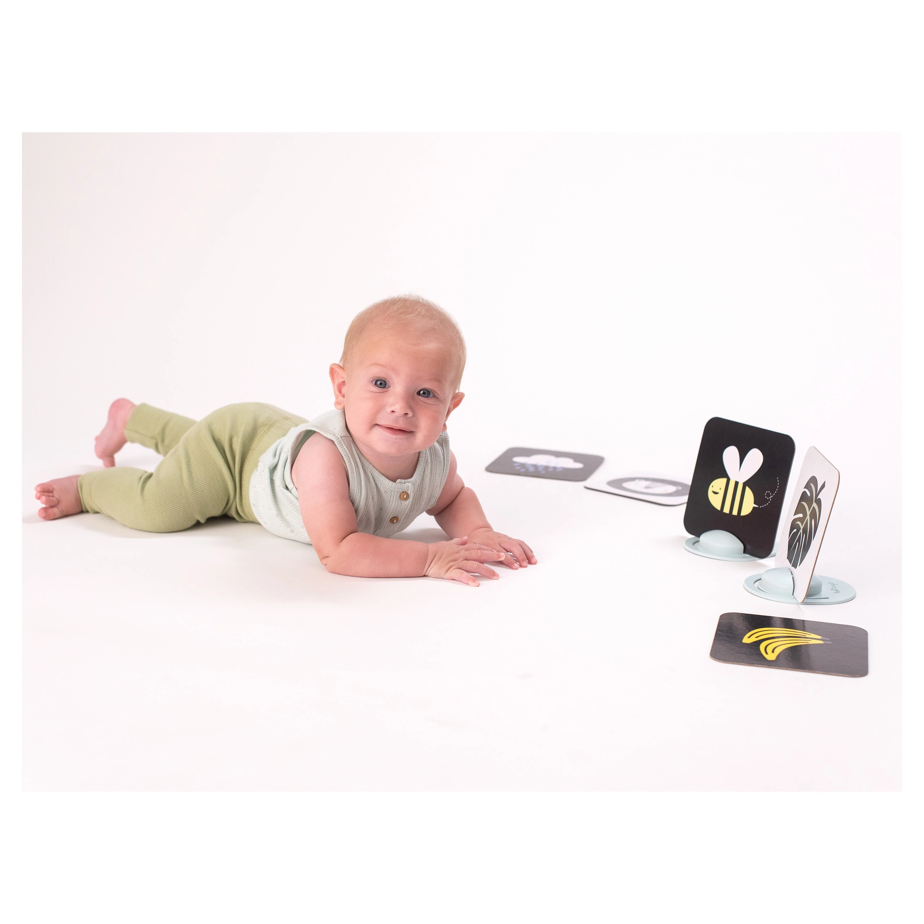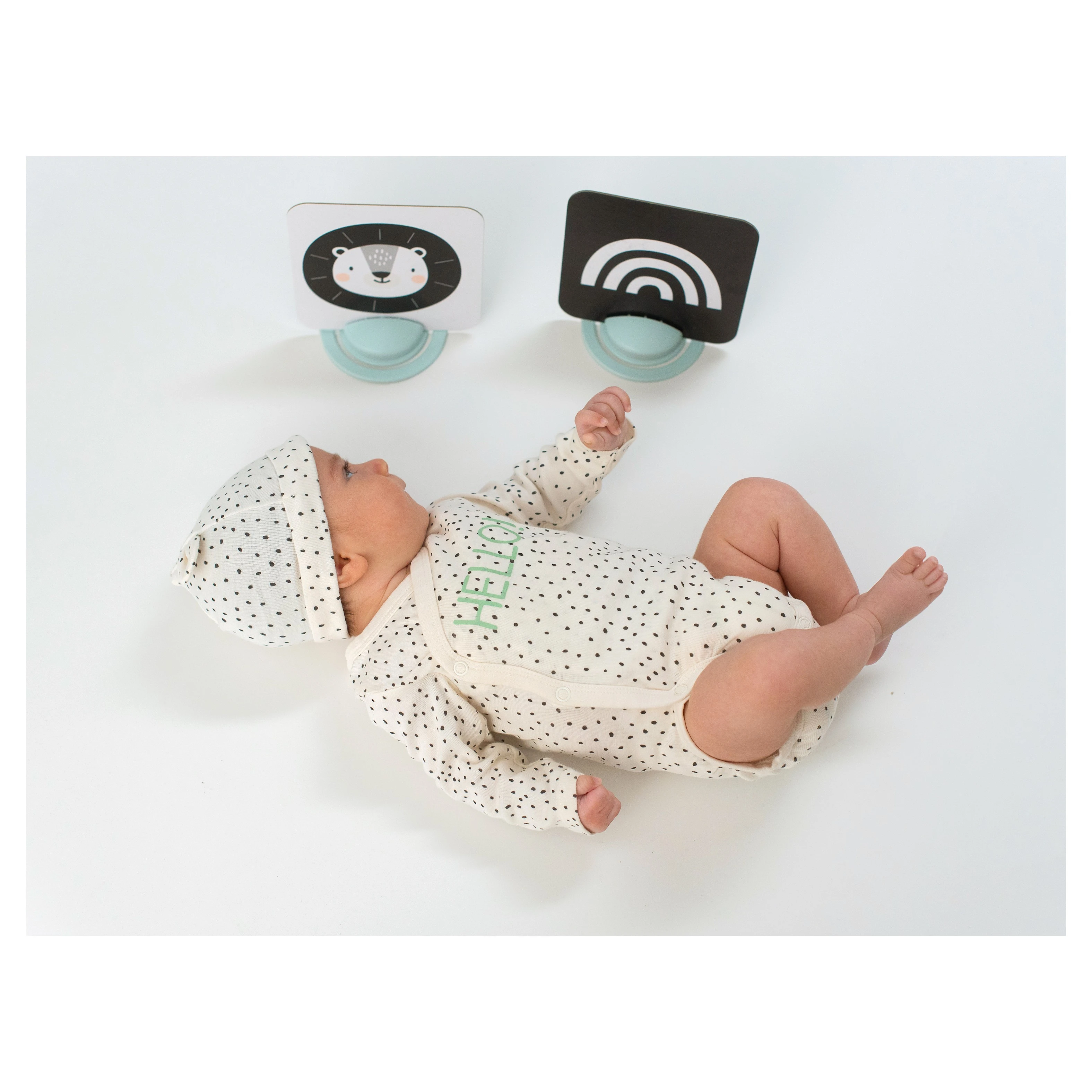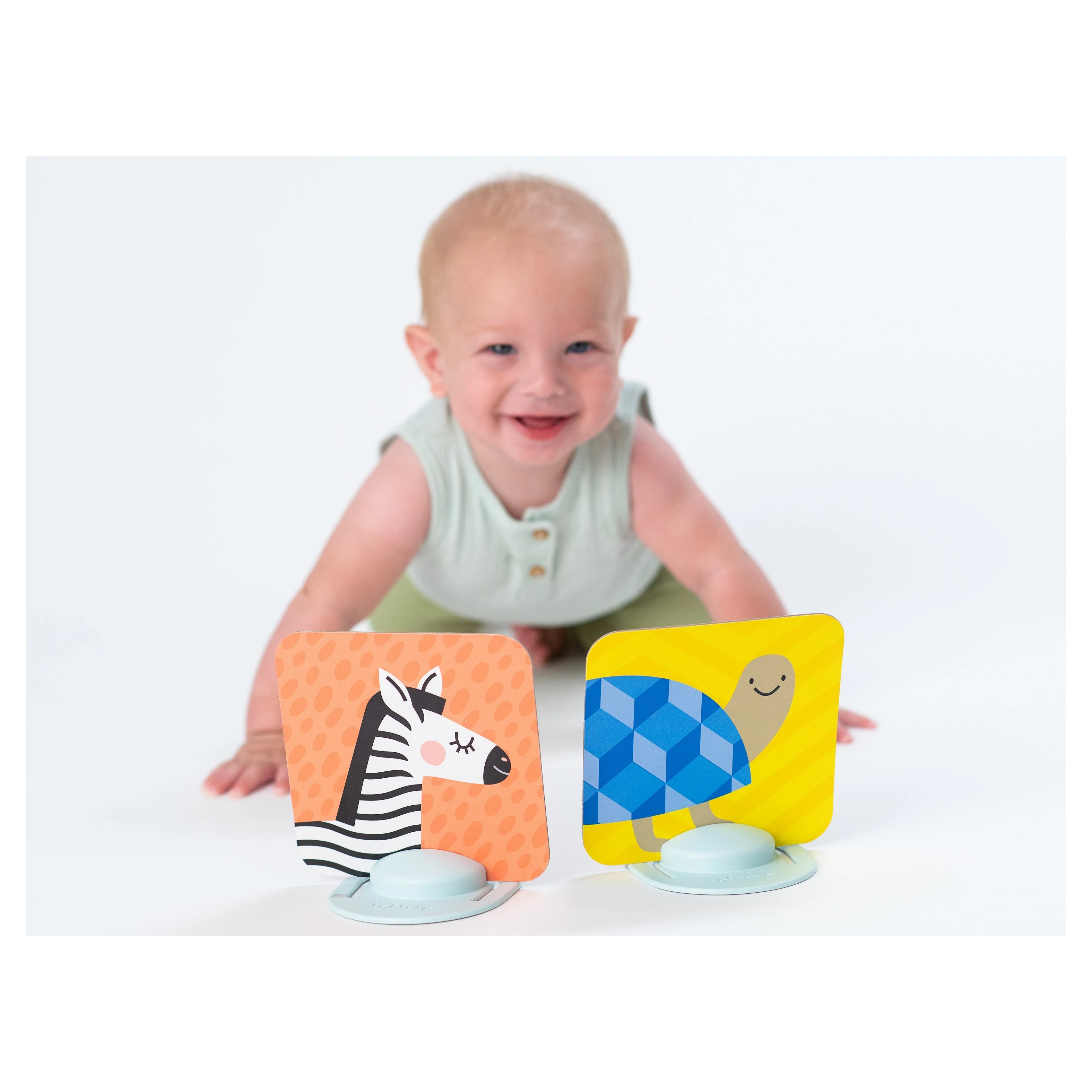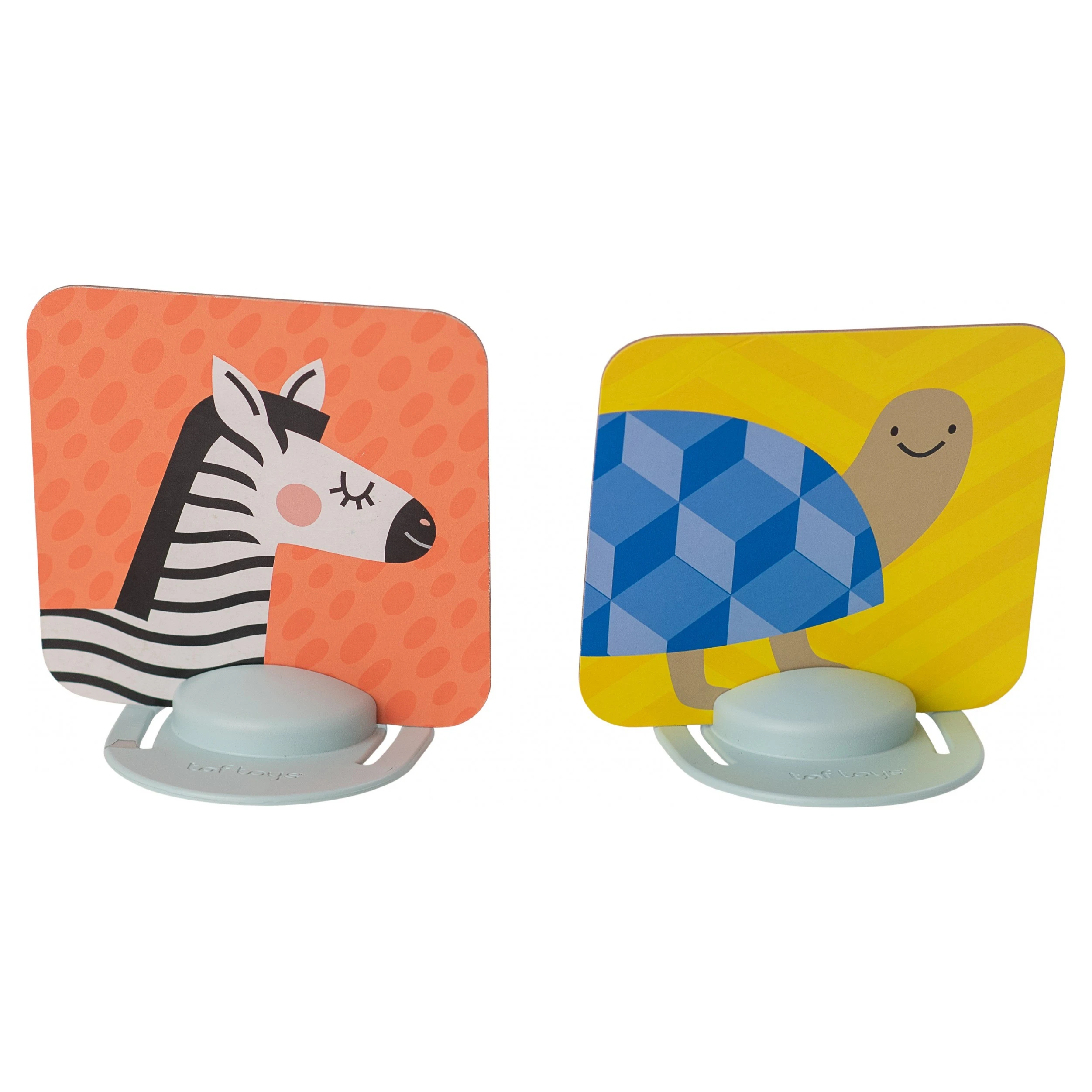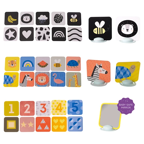 Taf Toys unikátní sada obrázků se dvěma stojánky zabaví vaše dítě a zároveň pomáhá rozvíjet jeho zrak a jemnou motoriku od narození.Se stojánky je možné obrázky postavit před dítko v poloze na bříšku. V balení jsou celkem 3 sety pro různá věková stádia dítěte.