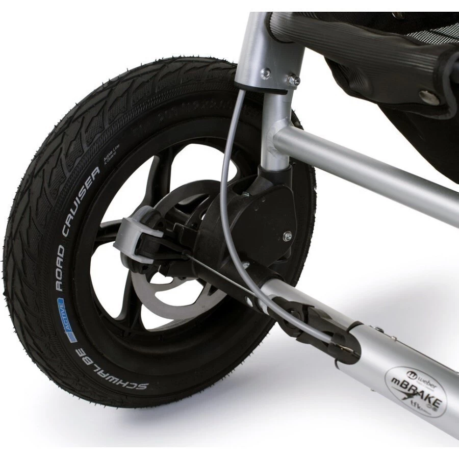 Při běhu nebo jízdě na in-linech oceníte ruční kotoučovou brzdu na rukojeti kočárku, kterou lze výškově nastavit.