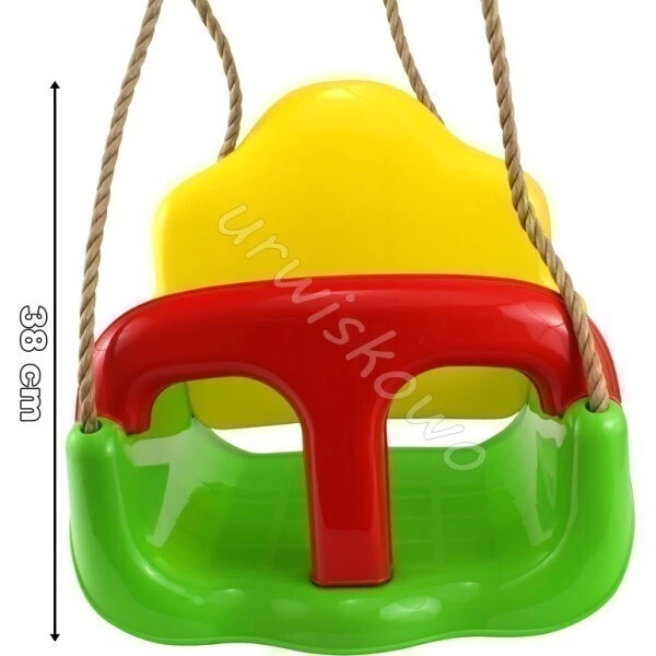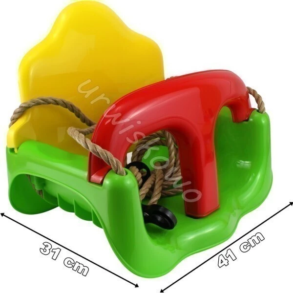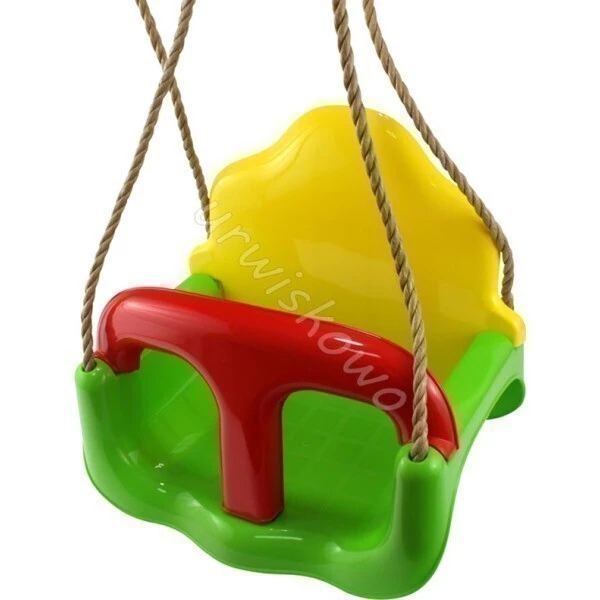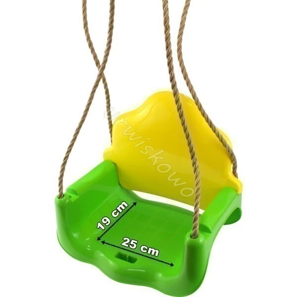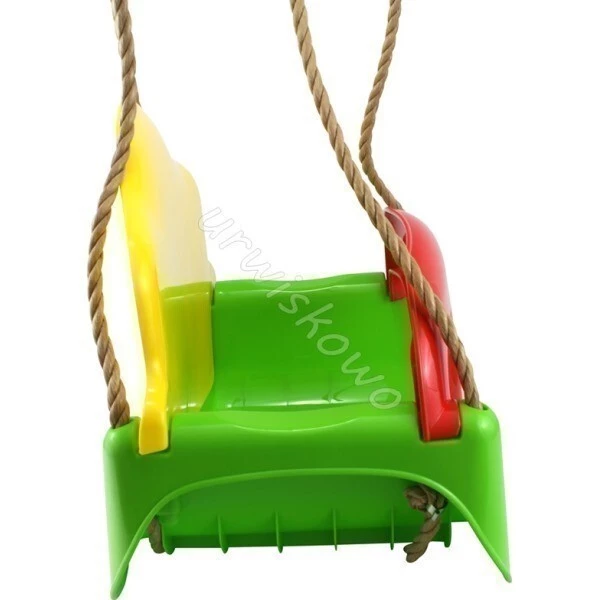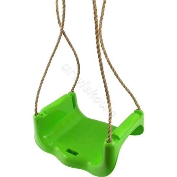 Houpačka je vyrobena z lehkého a odolného plastu a pevného lana.