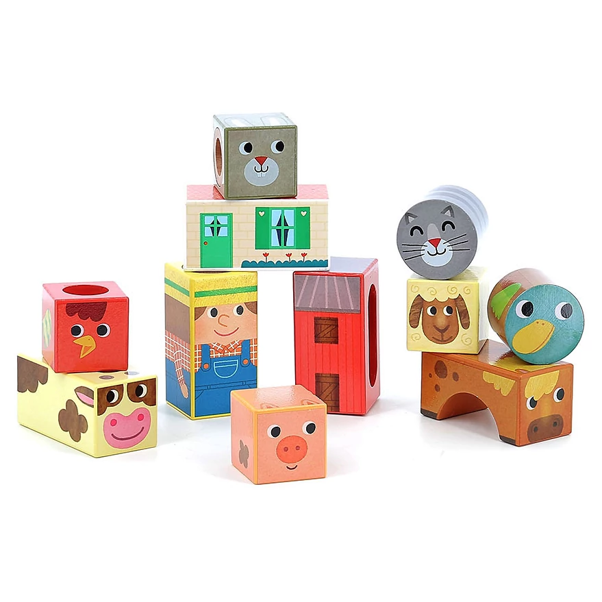 Design kostek pochází od francouzské umělkyně Mélusine Allirol, jejíž barevné a roztomilé ilustrace zvířátek z farmy přinášejí dětem radost a podporují jejich představivost. Díky kombinaci tradičního řemeslného zpracování a moderního designu jsou tyto kostky nadčasovou hračkou, která osloví děti i rodiče.
