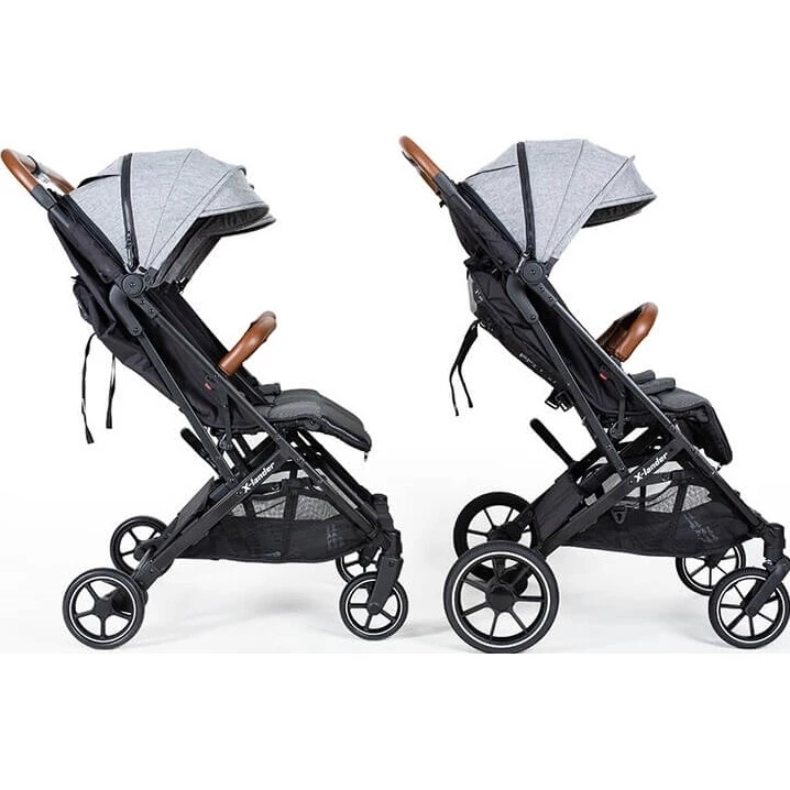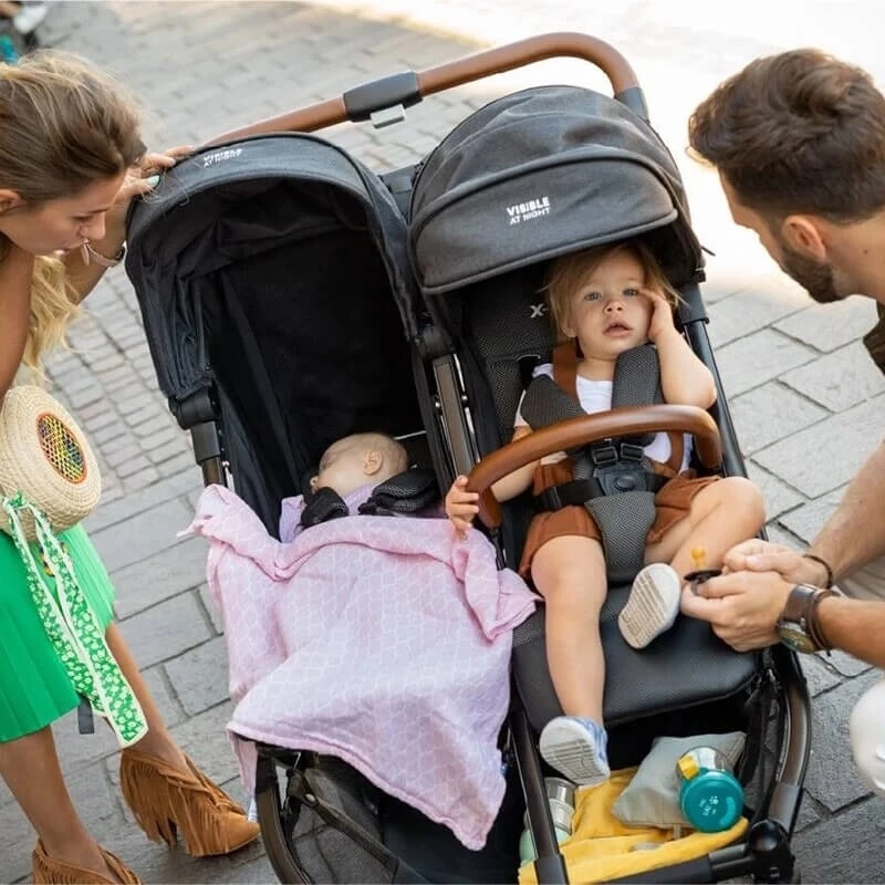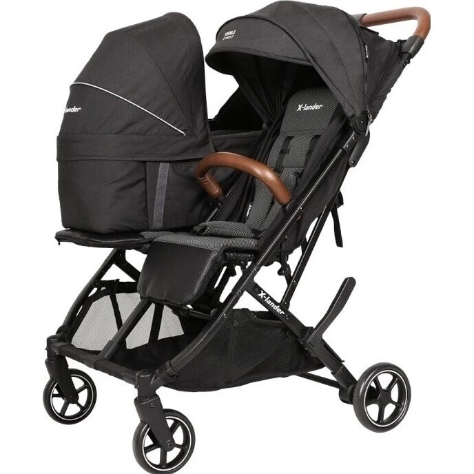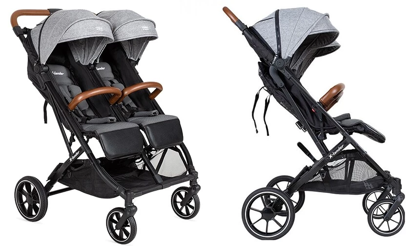 X-Lander X-Double je praktický kočárek pro dvojčata, který váží pouze 13,4 kg a projede bez problému dveřmi šíře 80 cm. Je široký pouze 73,5 cm. Kočárek se také snadno skládá a lze ho nezávisle napolohovat až do lehu. Ke kočárku je možné dokoupit korbu X-Nest. Pak ho lze použít i pro sourozence narozené blízko u sebe.Po složení se kočárek automaticky zamkne. Díky tomu se složený snadno přenáší. Každá sedačka má nezávislé madlo. Každé sedadlo má polstrované měkké pásy, které zajistí bezpečnost.