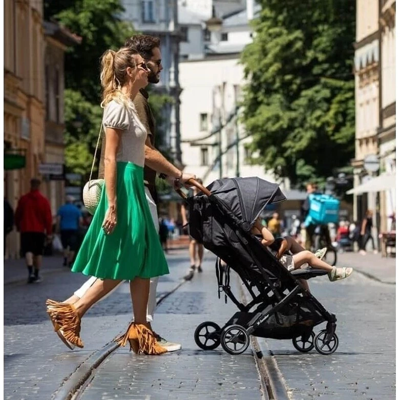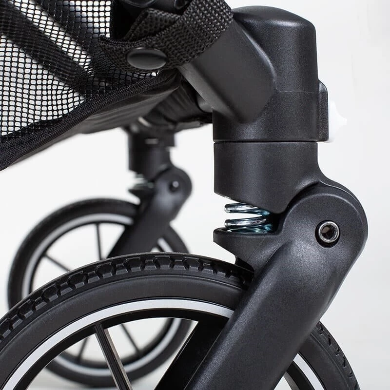Přední kola jsou otočná a zadní mají parkovací nožní brzdu. Boční odrazky na kolech a na stříšce zviditelňují kočárek během horšího počasí.